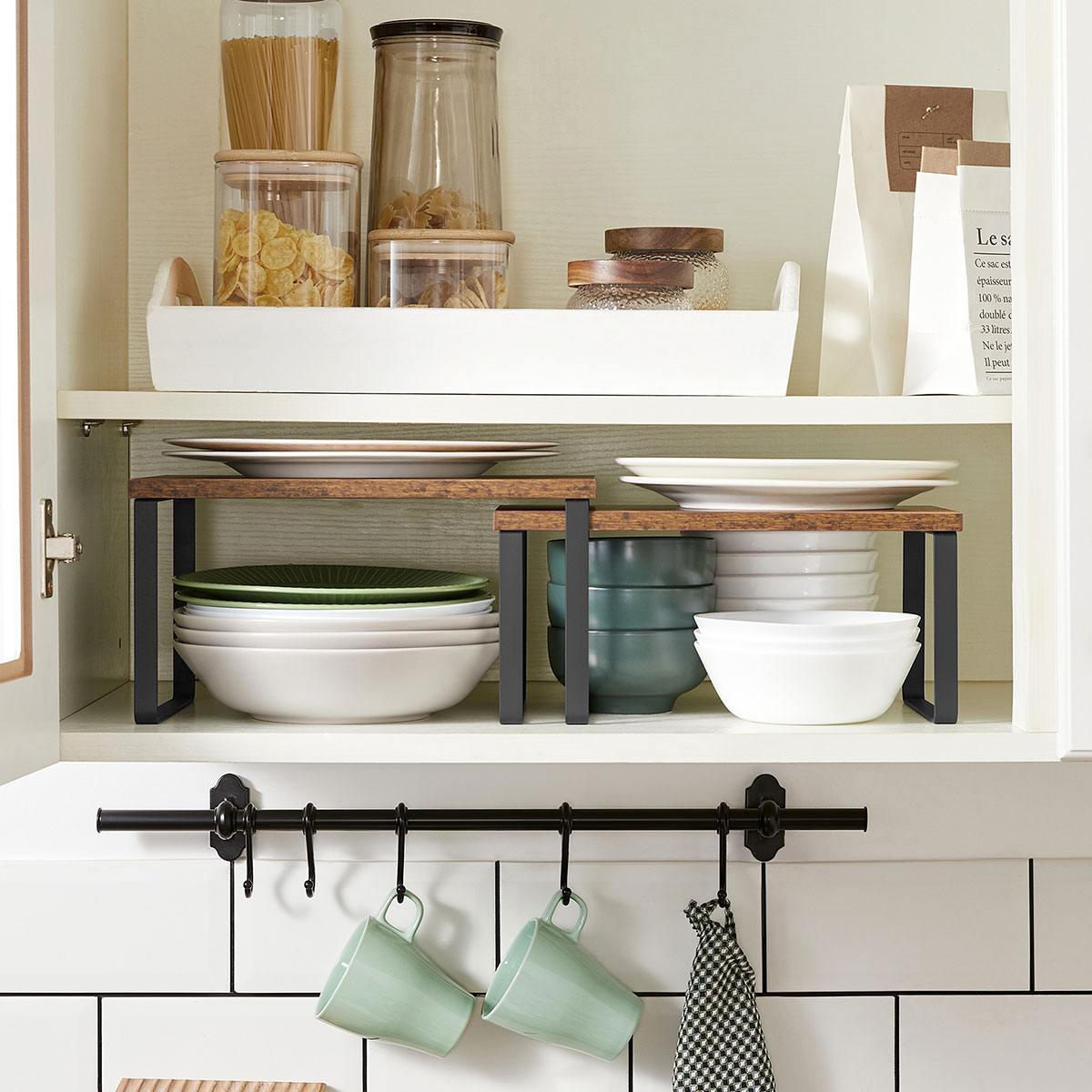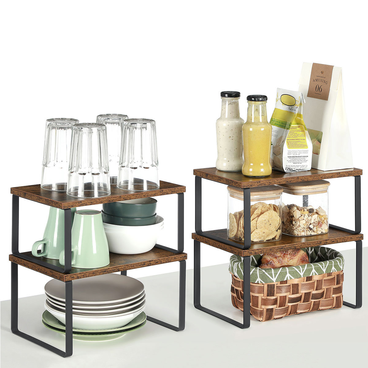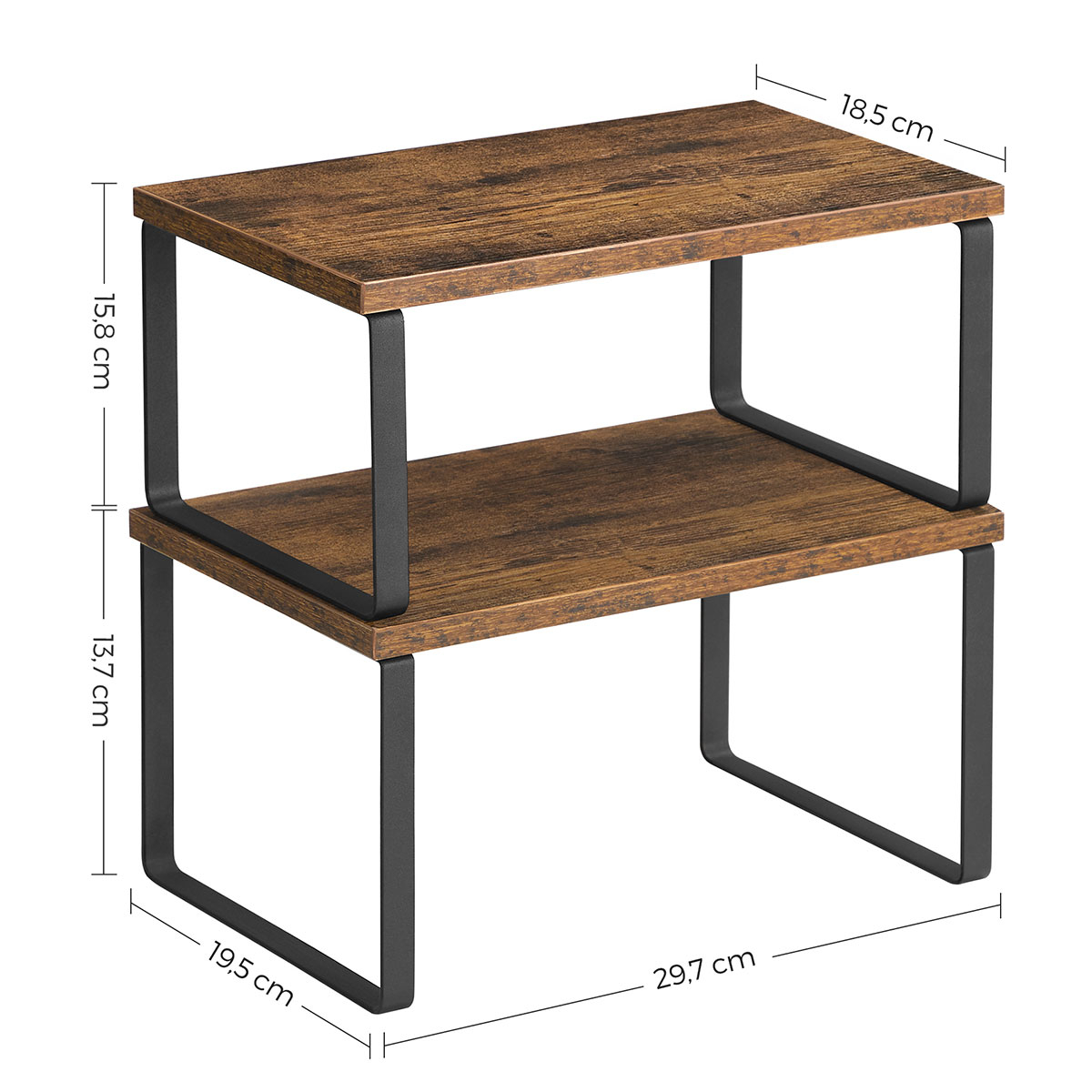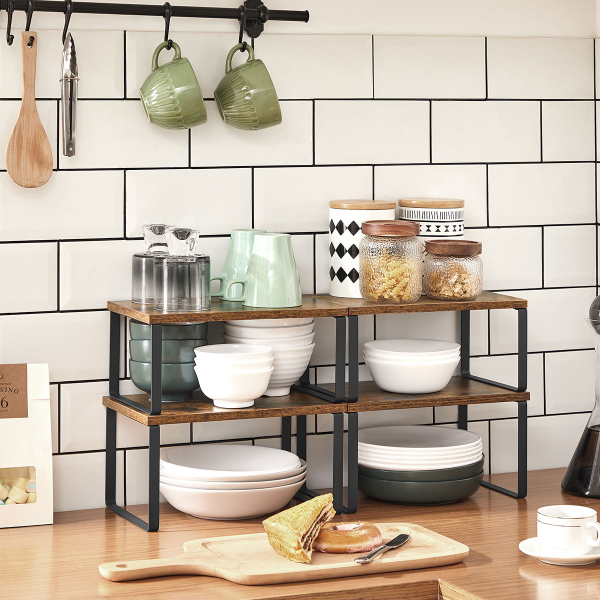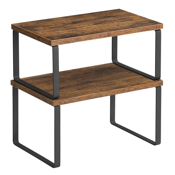 Ράφια οργάνωσης διαφορετικών μεγεθών σε σετ 2 τεμαχίων από την εταιρεία Songmics. Είναι κατασκευασμένα από ξύλο σε καφέ χρώμα και έχουν μαύρα μεταλλικά ποδαράκια. Είναι στοιβαζόμενα και μπορούν να τοποθετηθούν, το ένα πάνω στο άλλο. Χρησιμεύουν και ως βάση οθόνης, αλλά και για την οργάνωση γραφείου. Μέγιστο βάρος αντοχής ανά ράφι 15kg.