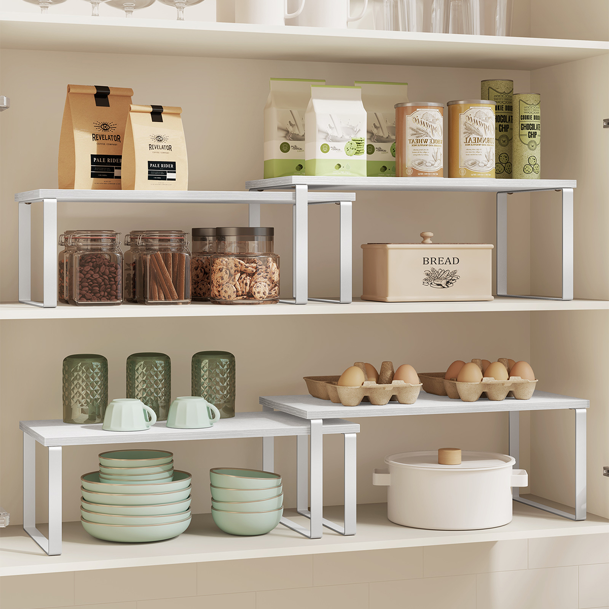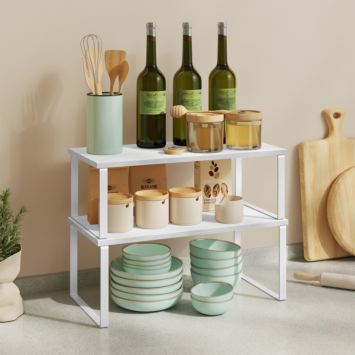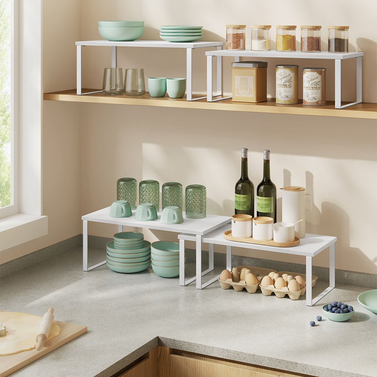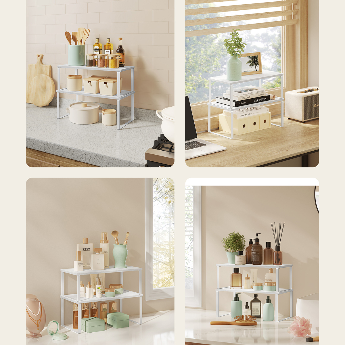 Ράφια οργάνωσης διαφορετικών μεγεθών σε σετ 2 τεμαχίων από την εταιρεία Songmics. Είναι κατασκευασμένα από μοριοσανίδα σε λευκό χρώμα με μεταλλικά πόδια. Είναι στοιβαζόμενα και μπορούν να τοποθετηθούν, το ένα πάνω στο άλλο, στον πάγκο της κουζίνας για να αξιοποιήσετε τον αχρησιμοποίητο χώρο προσφέροντας οργάνωση. Χρησιμεύουν και ως βάση οθόνης, αλλά και για την οργάνωση γραφείου. Μέγιστο βάρος αντοχής ανά ράφι 15kg.