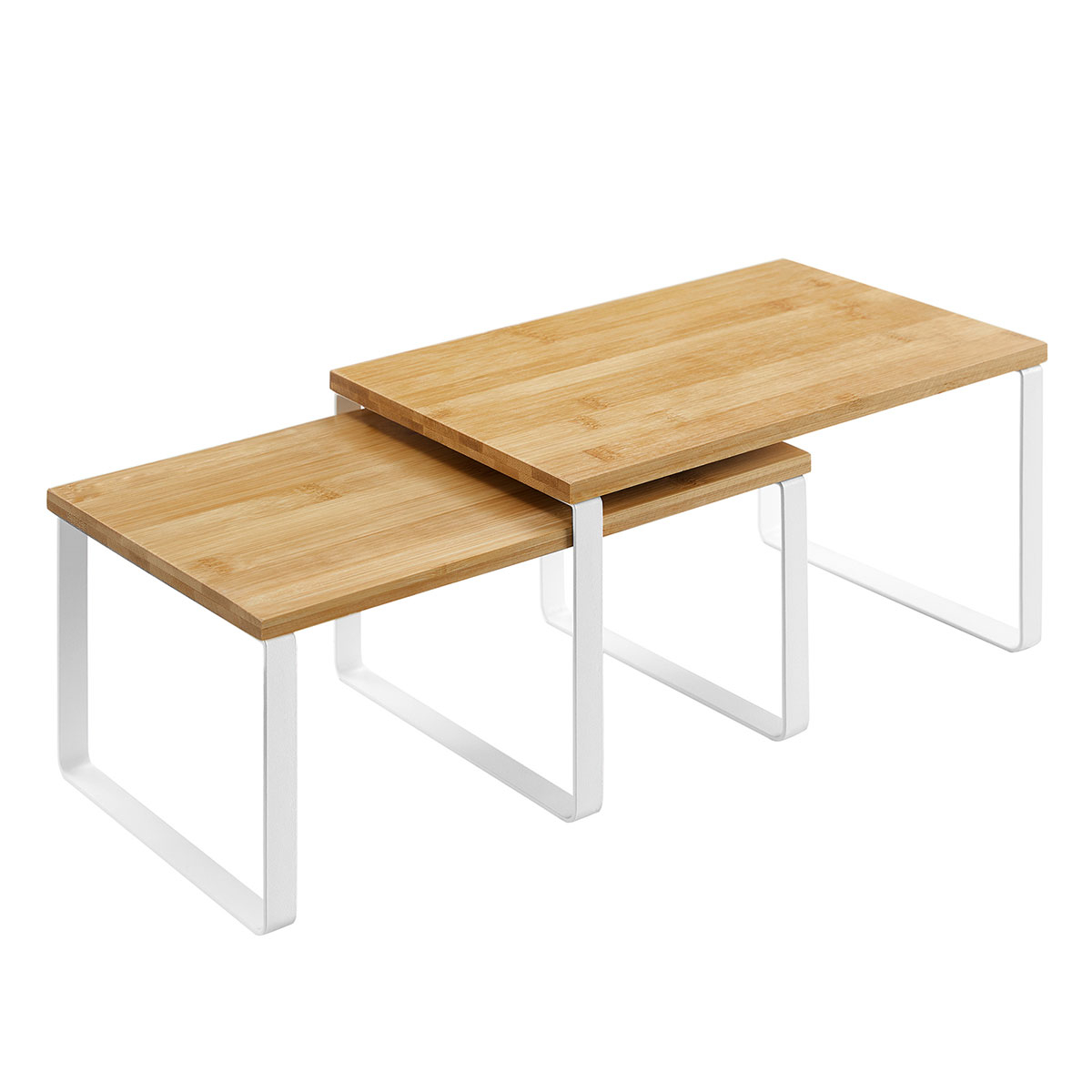 Ράφια οργάνωσης διαφορετικών μεγεθών σε σετ 2 τεμαχίων από την εταιρεία Songmics. Είναι κατασκευασμένα από ξύλο Bamboo σε μπεζ χρώμα και έχουν λευκά μεταλλικά ποδαράκια. Είναι στοιβαζόμενα και μπορούν να τοποθετηθούν, το ένα πάνω στο άλλο, στον πάγκο της κουζίνας για να αξιοποιήσετε τον αχρησιμοποίητο χώρο προσφέροντας οργάνωση. Χρησιμεύουν και ως βάση οθόνης, αλλά και για την οργάνωση γραφείου. Μέγιστο βάρος αντοχής ανά ράφι 15kg.