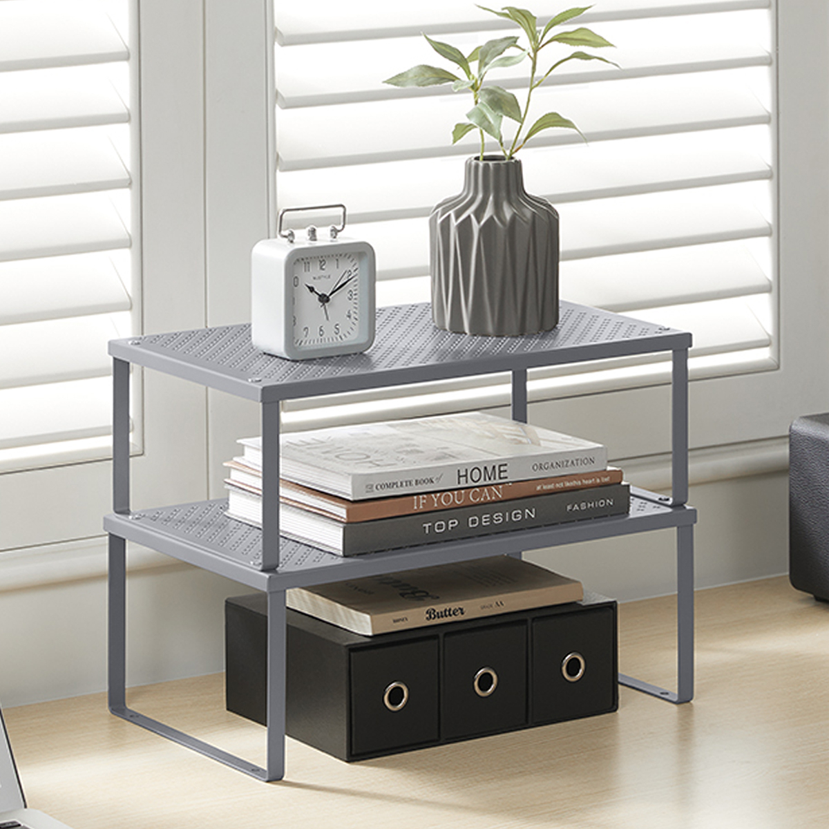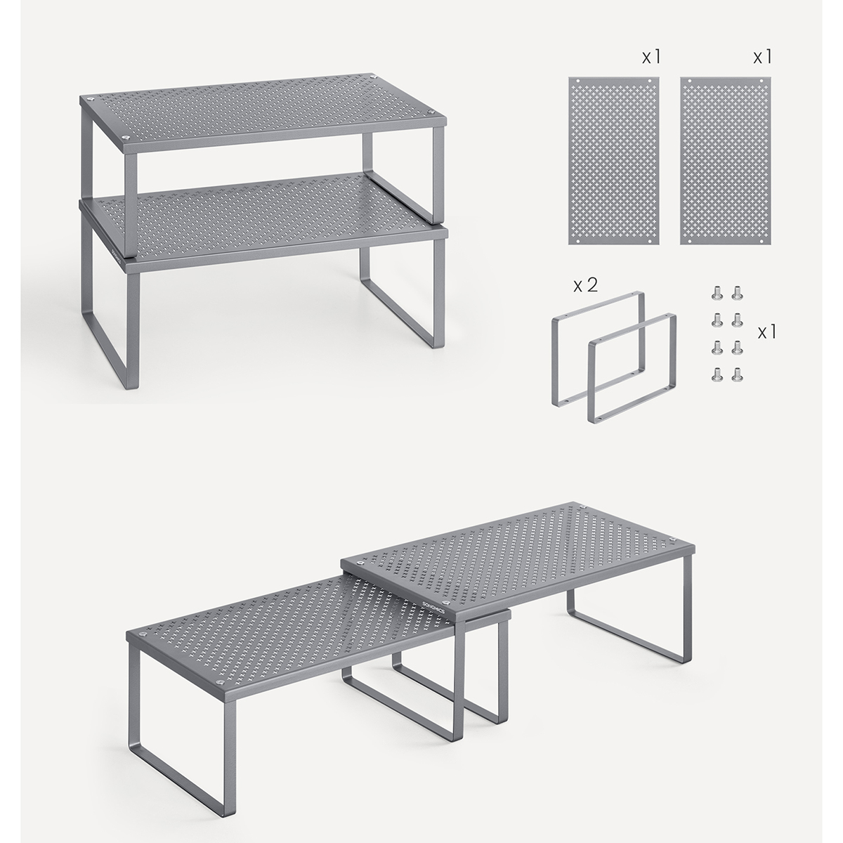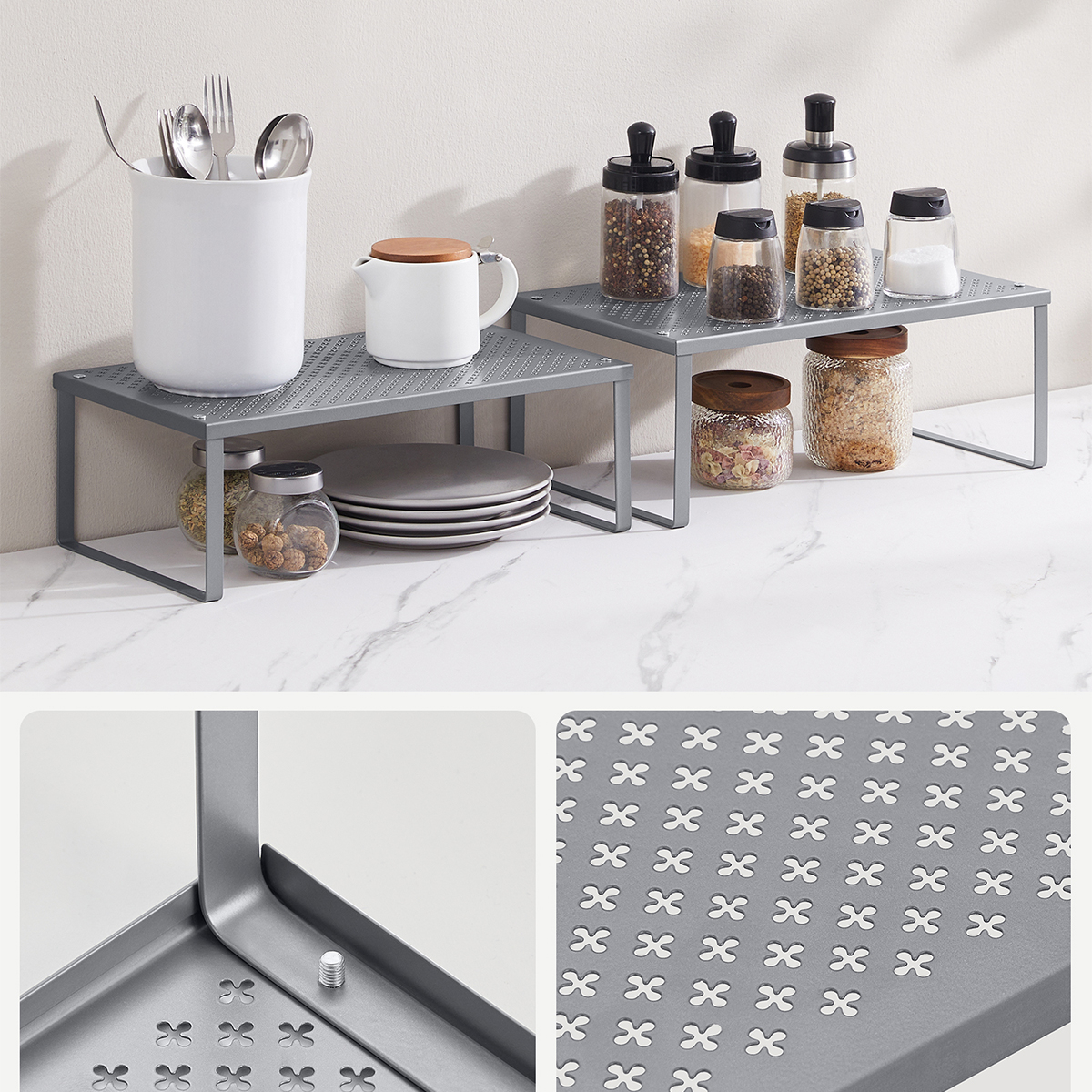 Ράφια οργάνωσης διαφορετικών μεγεθών σε σετ 2 τεμαχίων από την εταιρεία Songmics. Είναι κατασκευασμένα από ατσάλι σε γκρι χρώμα με διάτρητη επιφάνεια. Είναι στοιβαζόμενα και μπορούν να τοποθετηθούν, το ένα πάνω στο άλλο, στον πάγκο της κουζίνας για να αξιοποιήσετε τον αχρησιμοποίητο χώρο προσφέροντας οργάνωση. Χρησιμεύουν και ως βάση οθόνης, αλλά και για την οργάνωση γραφείου. Μέγιστο βάρος αντοχής ανά ράφι 16kg.