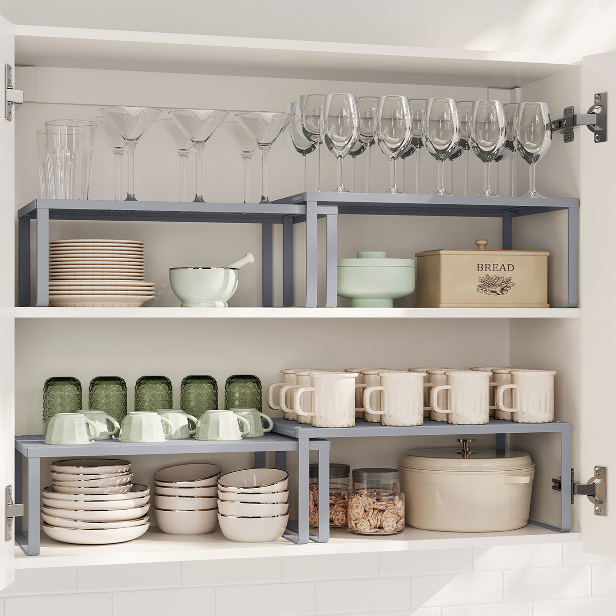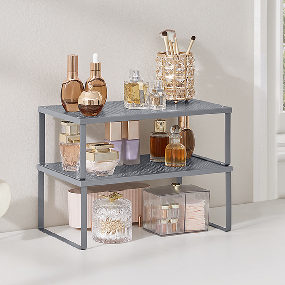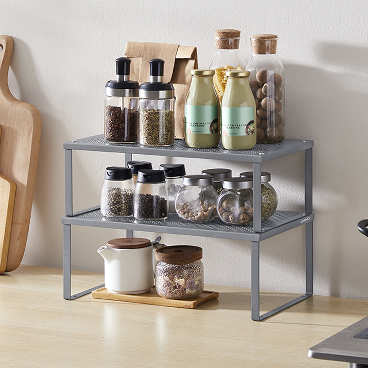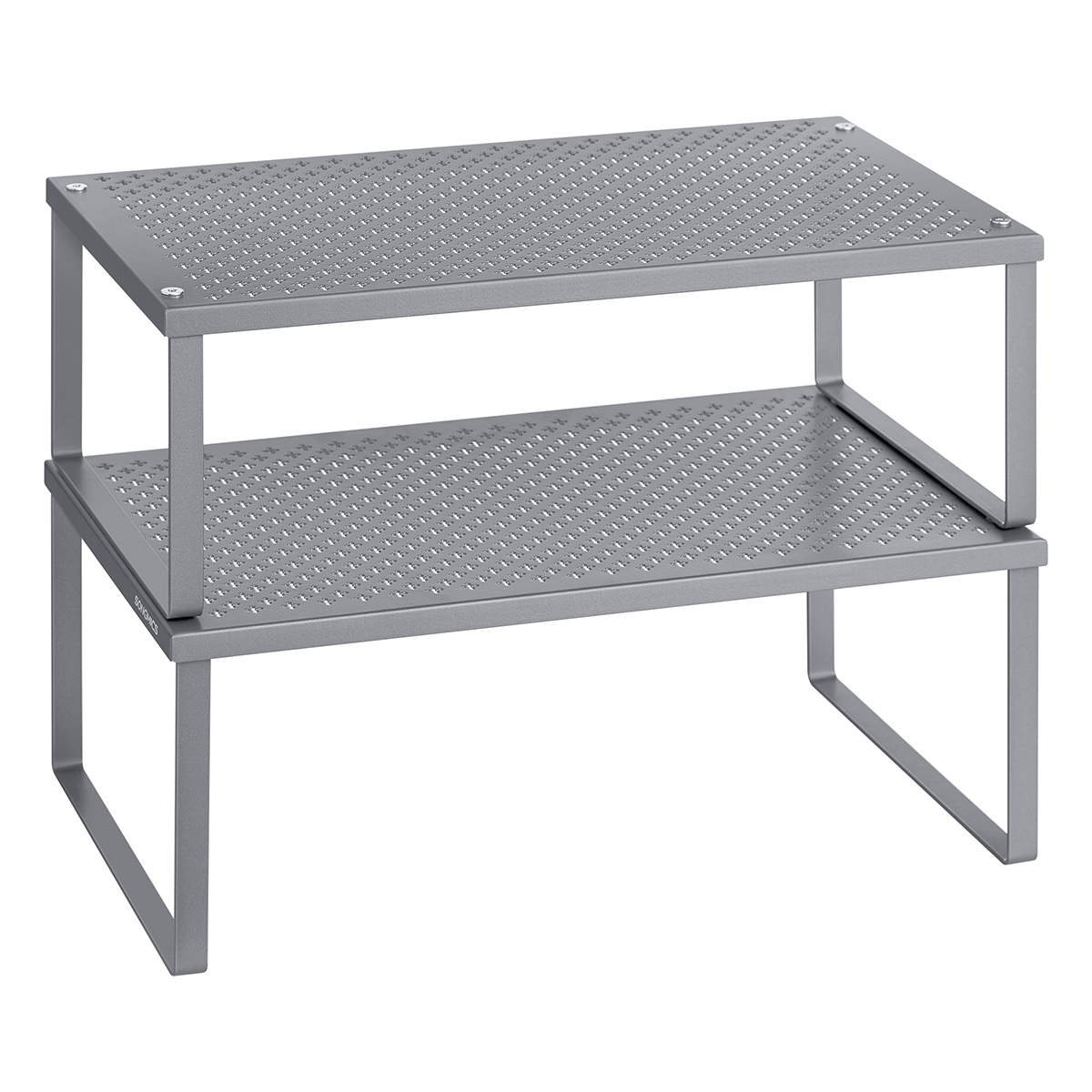 Ράφια οργάνωσης διαφορετικών μεγεθών σε σετ 2 τεμαχίων από την εταιρεία Songmics. Είναι κατασκευασμένα από ατσάλι σε γκρι χρώμα με διάτρητη επιφάνεια. Είναι στοιβαζόμενα και μπορούν να τοποθετηθούν, το ένα πάνω στο άλλο, στον πάγκο της κουζίνας για να αξιοποιήσετε τον αχρησιμοποίητο χώρο προσφέροντας οργάνωση. Χρησιμεύουν και ως βάση οθόνης, αλλά και για την οργάνωση γραφείου. Μέγιστο βάρος αντοχής ανά ράφι 16kg.