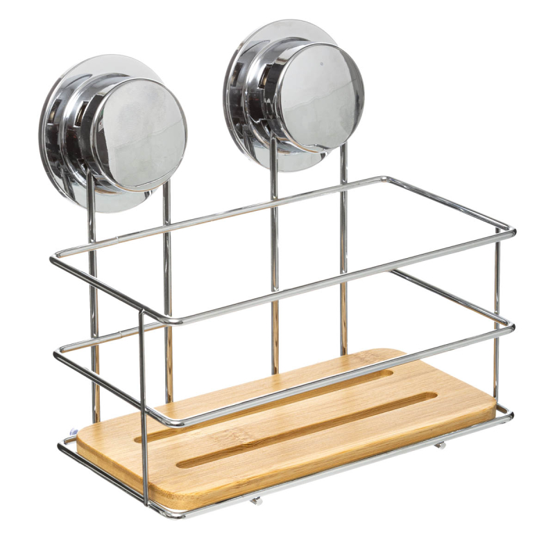 Ράφι για την οργάνωση του μπάνιου με μοντέρνο σχεδιασμό. Είναι κατασκευασμένο από μέταλλο σε απόχρωση χρωμίου και ξύλο bamboo. Διαθέτει 2 ισχυρές βεντούζες για την στερέωση στον τοίχο. Μέγιστο βάρος αντοχής: 6 kg.