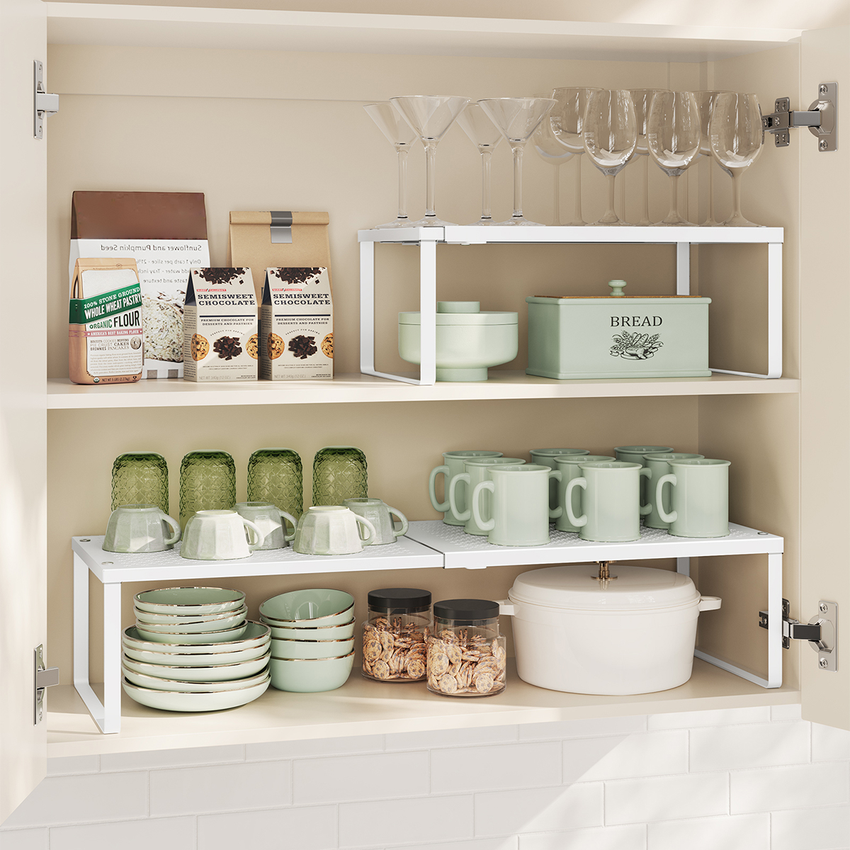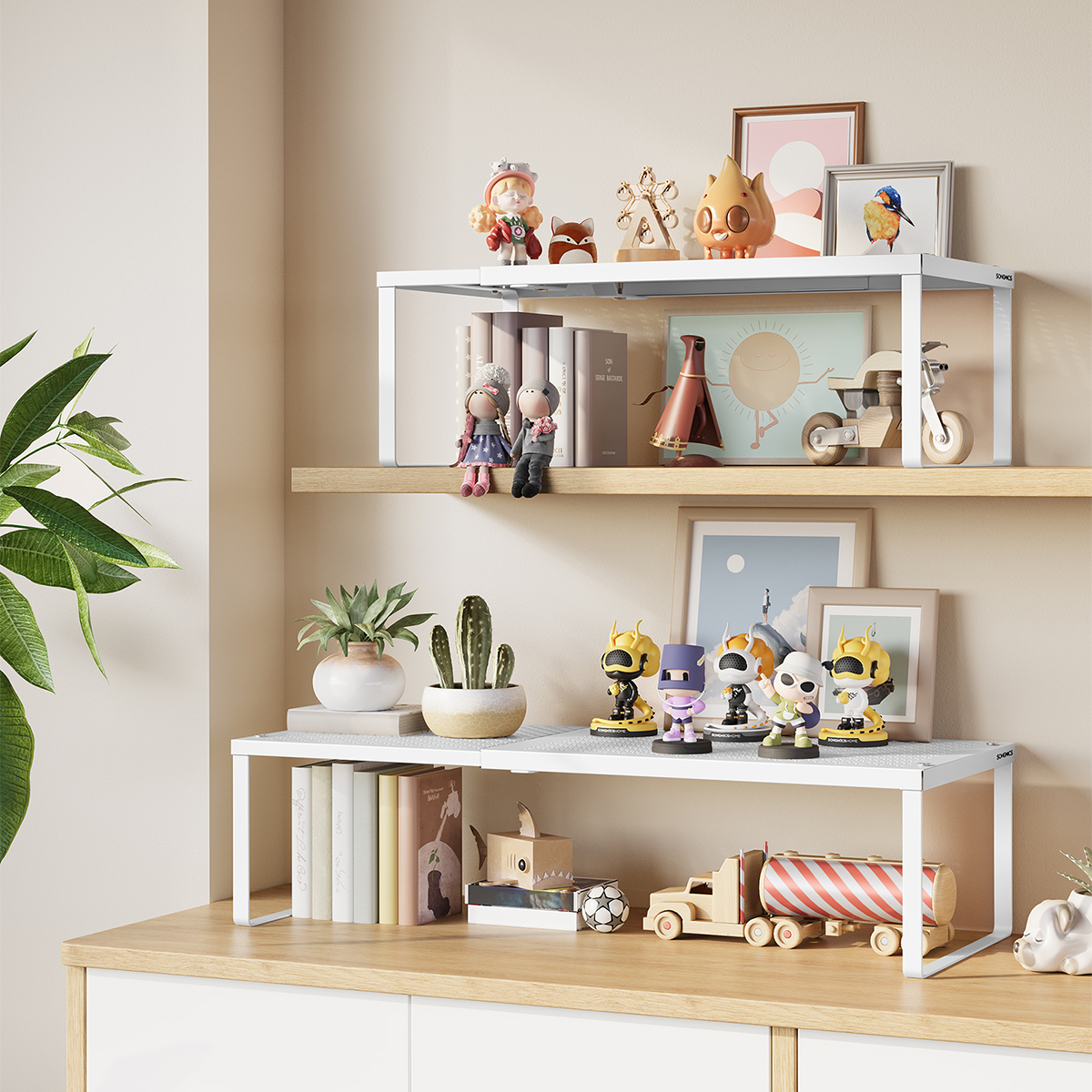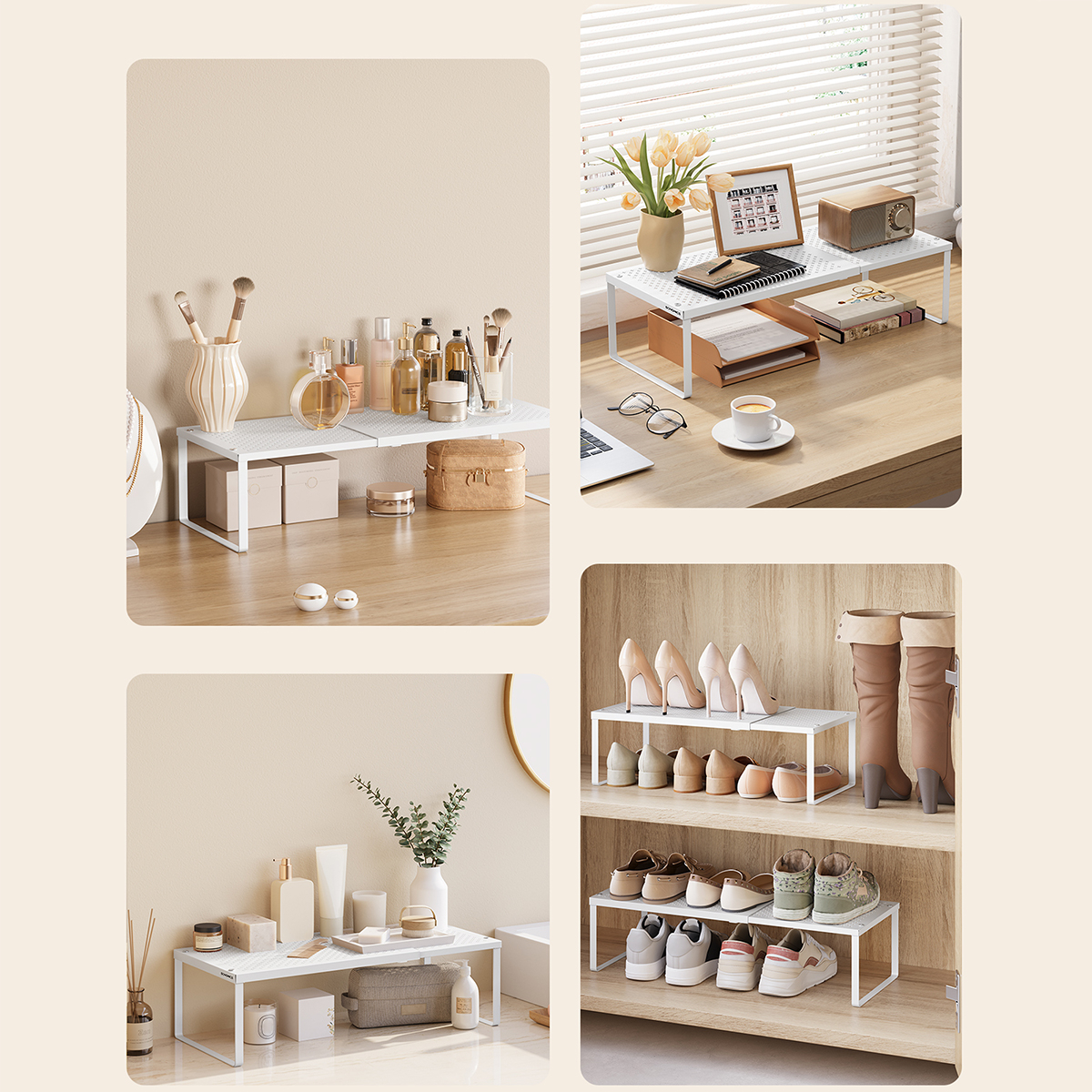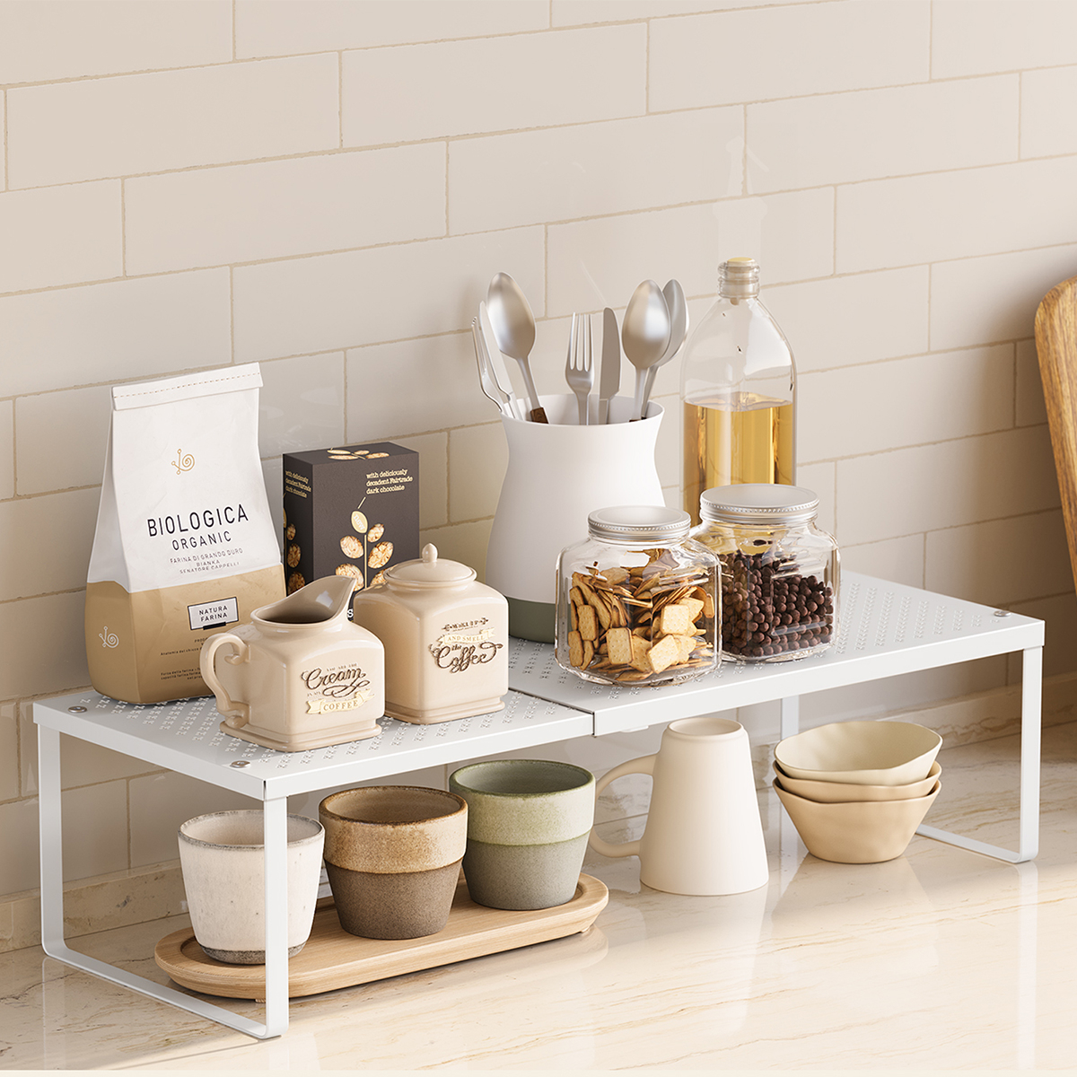 Ράφι οργάνωσης με ρυθμιζόμενο μήκος από την εταιρεία Songmics. Είναι κατασκευασμένο από ατσάλι σε λευκό χρώμα με διάτρητη επιφάνεια. Ιδανικό για τον πάγκο της κουζίνας για να αξιοποιήσετε τον αχρησιμοποίητο χώρο προσφέροντας οργάνωση στα βάζα ή τα μπαχαρικά σας. Χρησιμεύει και ως βάση οθόνης, αλλά και για την οργάνωση γραφείου. Μέγιστο βάρος αντοχής 21kg.