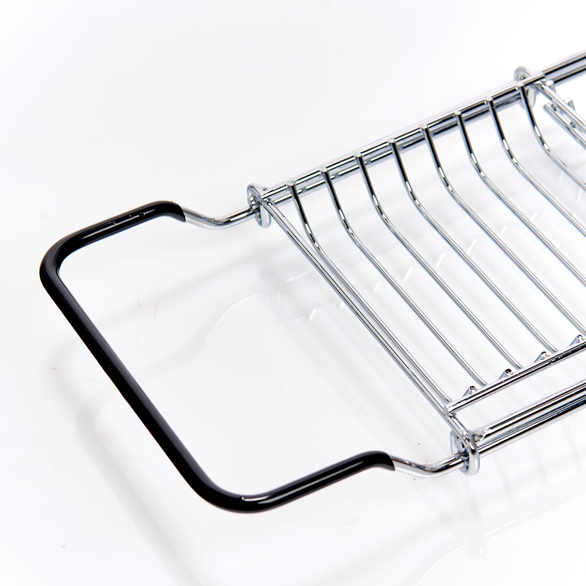 Ράφι μπανιέρας κατασκευασμένο από υψηλής ποιότητας επιχρωμιωμένο μέταλλο σε ασημί χρώμα με μαύρες λεπτομέρειες. Είναι επεκτεινόμενο για να ταιριάζει στις περισσότερες μπανιέρες. Διαθέτει πλαϊνά στηρίγματα με αντιολισθητική λαστιχένια επίστρωση για ασφαλή εφαρμογή στην άκρη της μπανιέρας. Είναι διάτρητο για την απομάκρυνση του νερού και για να αποφεύγεται η συσσώρευση υγρασίας. Είτε για πρακτικό λόγω όπως ξυράφια, σαπούνια κ.λπ., είτε για κεριά και ποτά, είτε μόνοι, είτε ως ζευγάρι, το ράφι μπάνιου σας δίνει τη δυνατότητα να απολαύσετε στο έπακρο την απόλαυση του μπάνιου. Ιδανικό για να οργανώσετε τα μπουκάλια των σαμπουάν και των αφρόλουτρών σας.