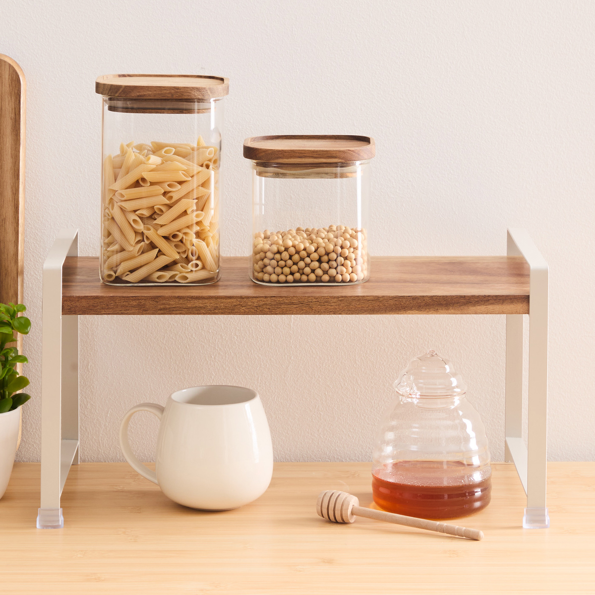Ράφι οργάνωσης με μοντέρνο σχεδιασμό. Είναι κατασκευασμένο από ξύλο ακακίας σε μπεζ χρώμα με εκρού μεταλλικό σκελετό. Διαθέτει εργονομικές λαβές για εύκολη μεταφορά. Μπορεί να τοποθετηθεί στον πάγκο της κουζίνας σας και να αξιοποιήσει τον αχρησιμοποίητο χώρο προσφέροντας οργάνωση. Ιδανικό ράφι για να ακουμπήσετε τα βάζα ή τα μπαχαρικά σας πάνω και κάτω από αυτό. Μπορεί επίσης να χρησιμοποιηθεί στο σαλόνι για να βάλετε τα γλαστράκια σας ή για την οργάνωση του γραφείου σας. Συνδυάστε το με τα υπόλοιπα είδη της ίδιας σειράς για ένα ολοκληρωμένο αποτέλεσμα.