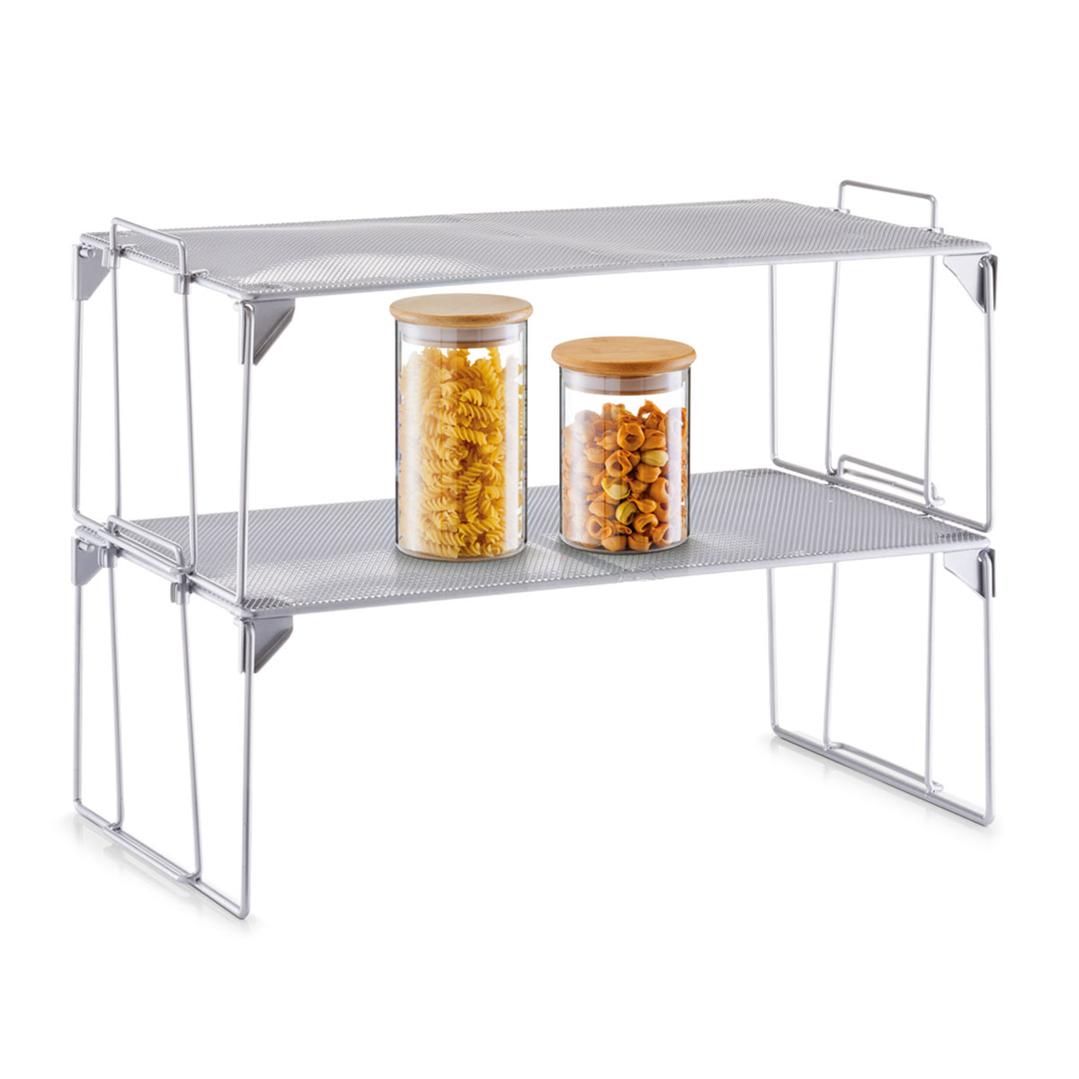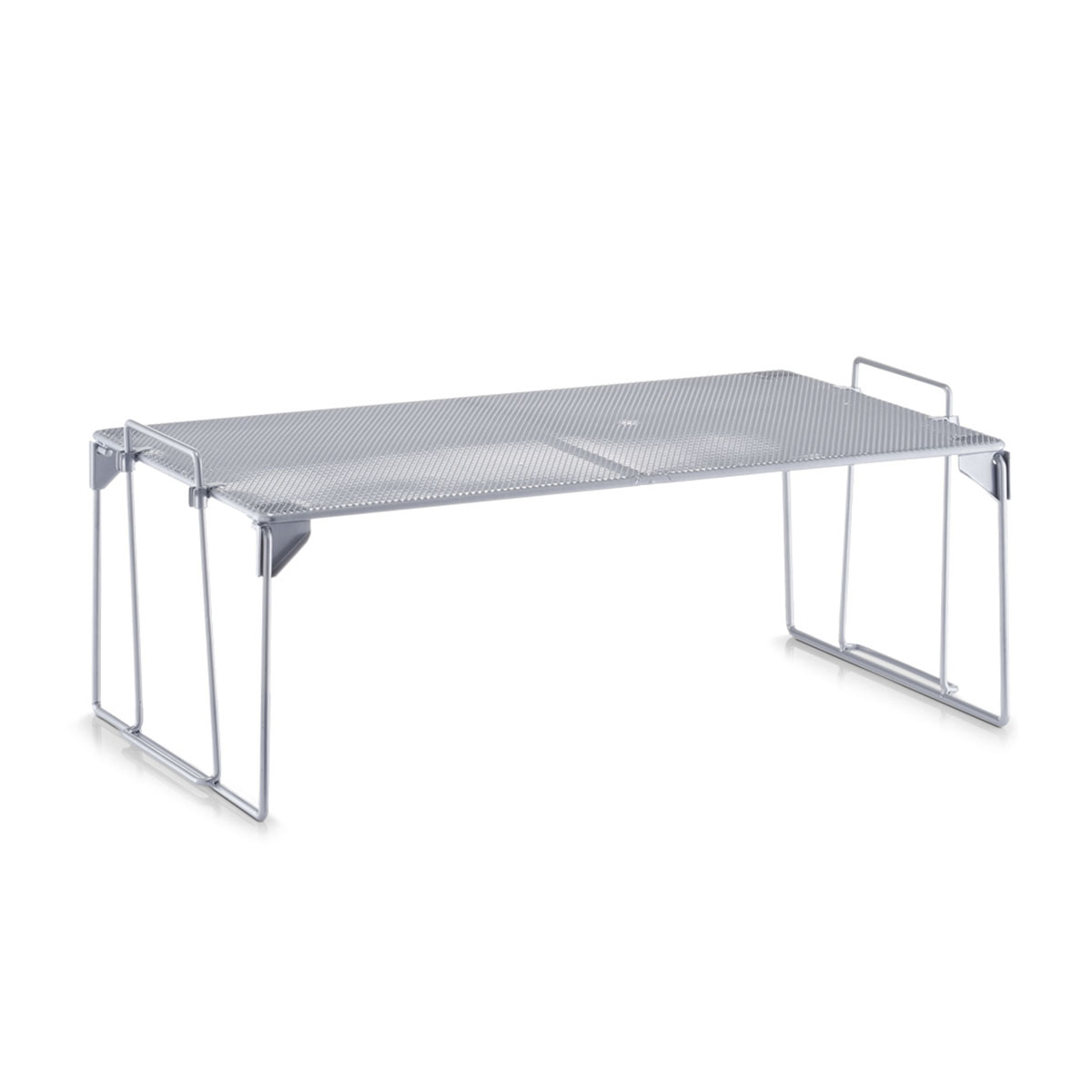 Ράφι οργάνωσης ιδανικό για τη δημιουργία επιπλέον επιπέδων σε ντουλάπια και ράφια. Είναι κατασκευασμένο από μεταλλικό σύρμα σε ασημί χρώμα με ηλεκτροστατική βαφή. Βοηθά στην καλύτερη οργάνωση του χώρου και είναι κατάλληλο για χρήση σε ντουλάπια κουζίνας, αποθήκες τροφίμων ή μπάνιο. Πολλά ράφια μπορούν να στοιβαχθούν το ένα πάνω στο άλλο, προσφέροντας ακόμη μεγαλύτερη χωρητικότητα αποθήκευσης. Ο πτυσσόμενος σχεδιασμός του επιτρέπει εύκολη αποθήκευση όταν δεν χρησιμοποιείται, εξοικονομώντας χώρο. Ιδανικό για να τοποθετηθεί στον πάγκο της κουζίνας σας και να αξιοποιήσει τον αχρησιμοποίητο χώρο προσφέροντας οργάνωση.