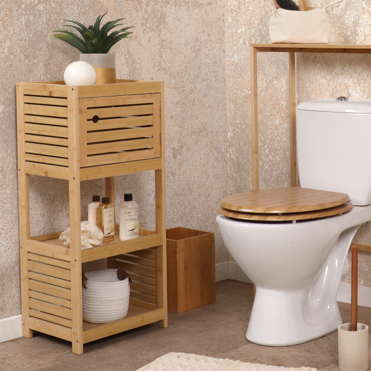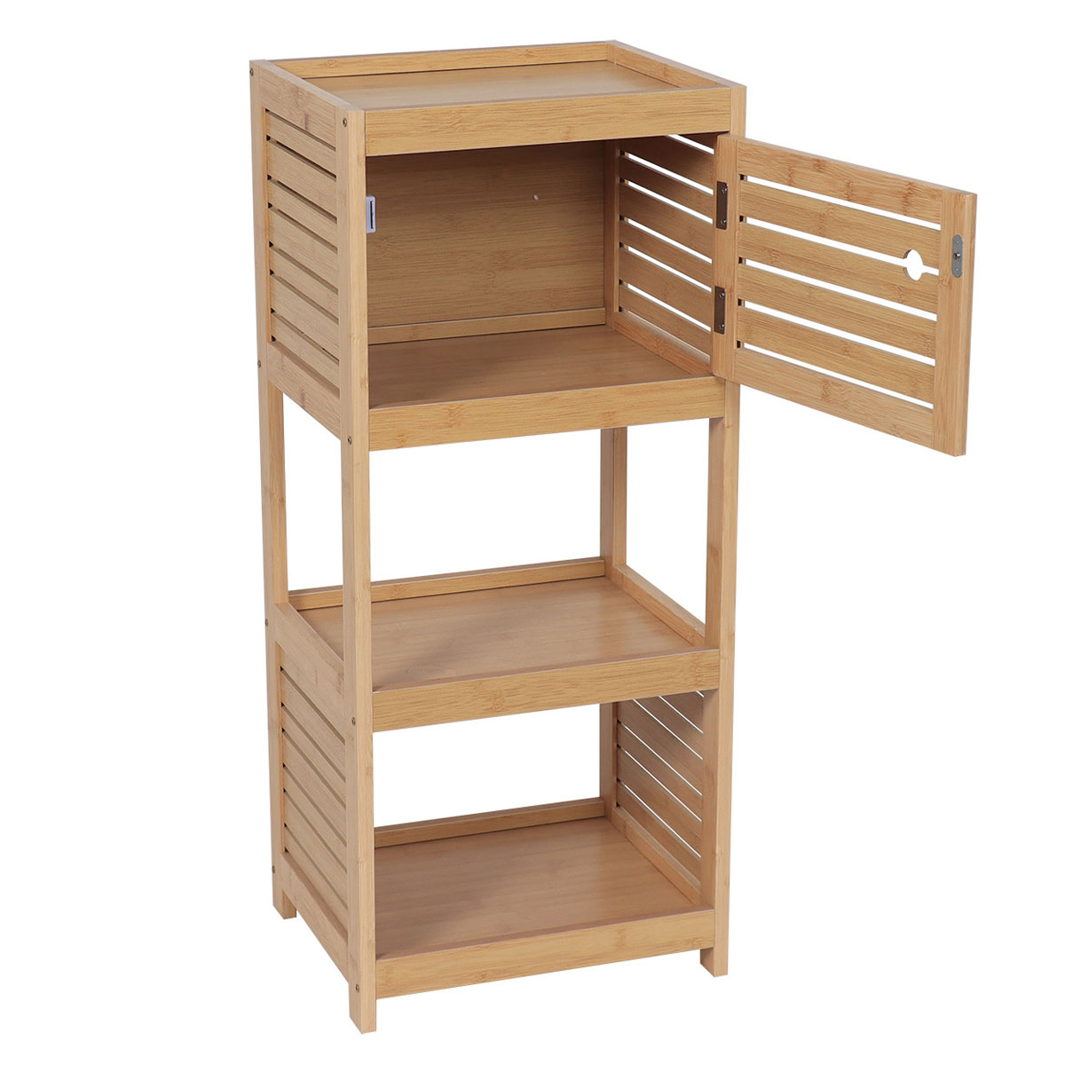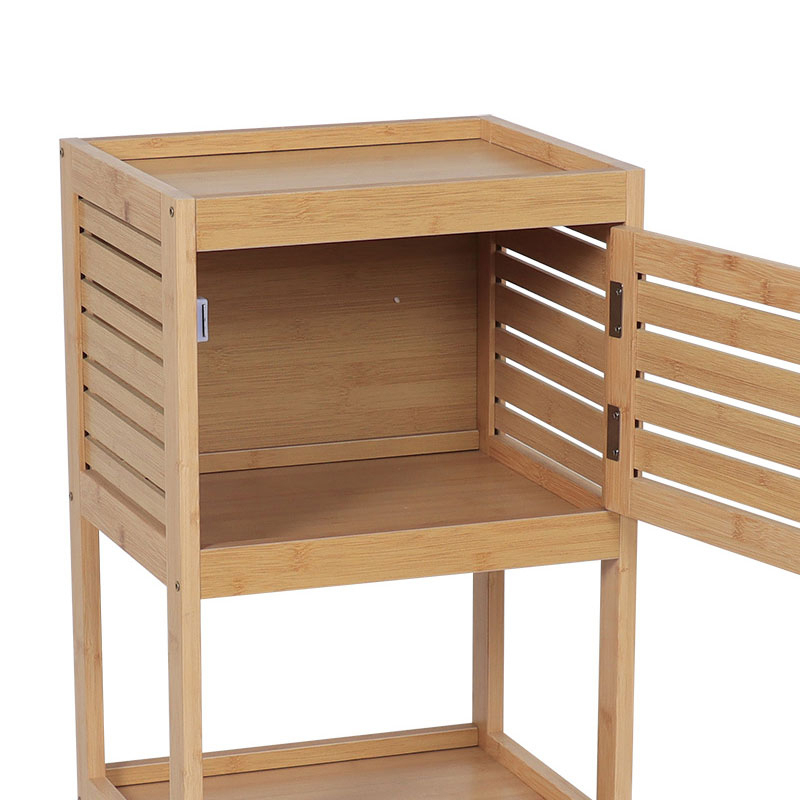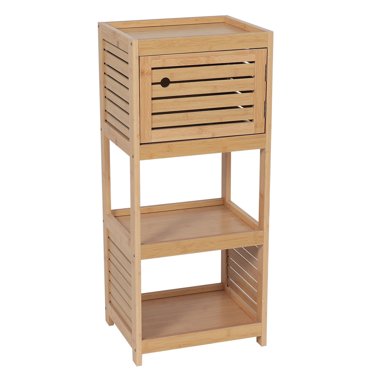 Ραφιέρα δαπέδου με 2 ράφια και ντουλάπι. Είναι κατασκευασμένη από ξύλο bamboo και MDF σε μπεζ χρώμα. Μπορεί να χρησιμοποιηθεί στο μπάνιο για τις πετσέτες, τα σαμπουάν κλπ. ή όπου αλλού θέλετε. Συνδυάστε τη με τα υπόλοιπα προϊόντα στο ίδιο σετ για ένα ολοκληρωμένο αποτέλεσμα. *Το προϊόν έρχεται αμοντάριστο και συναρμολογείται βάσει οδηγιών.*