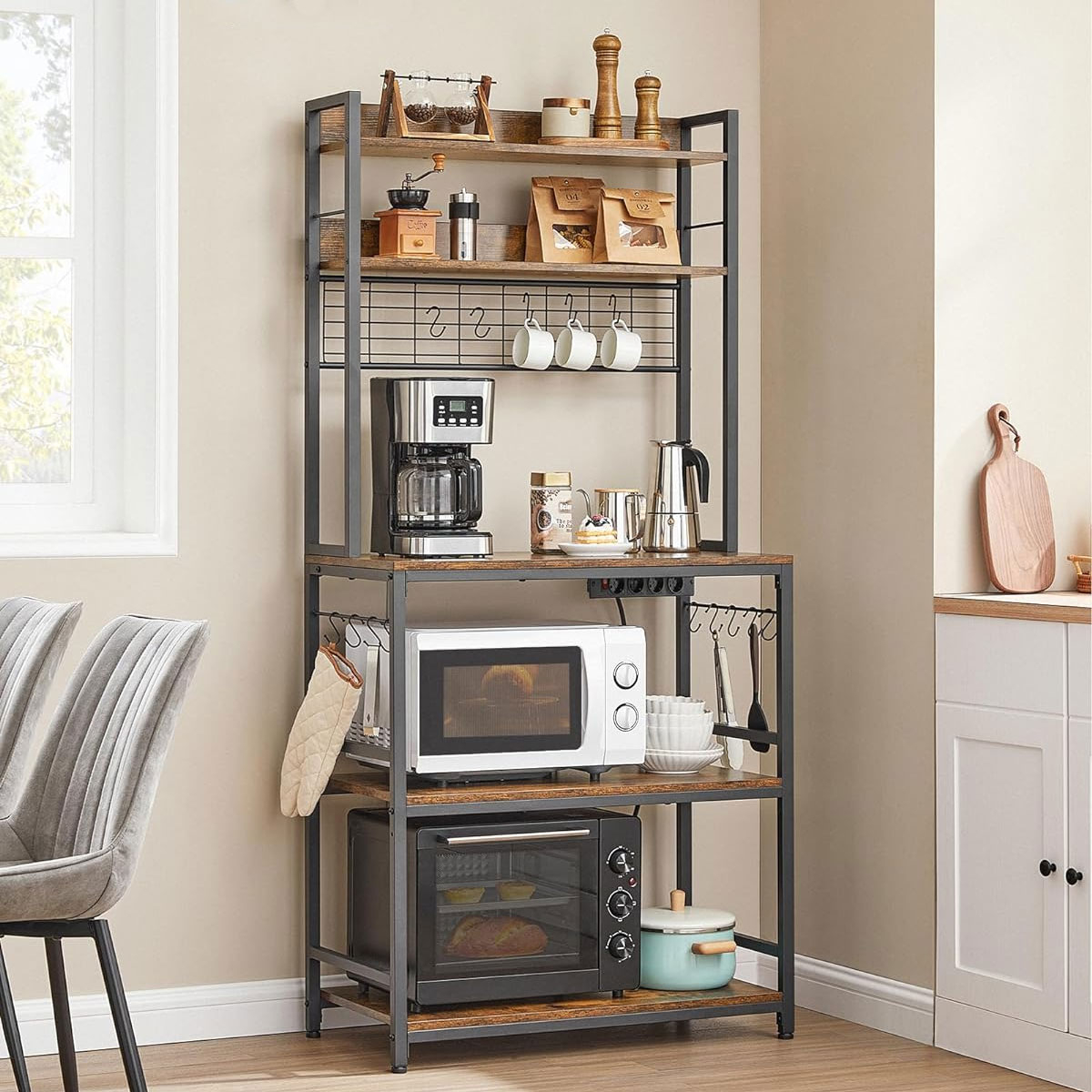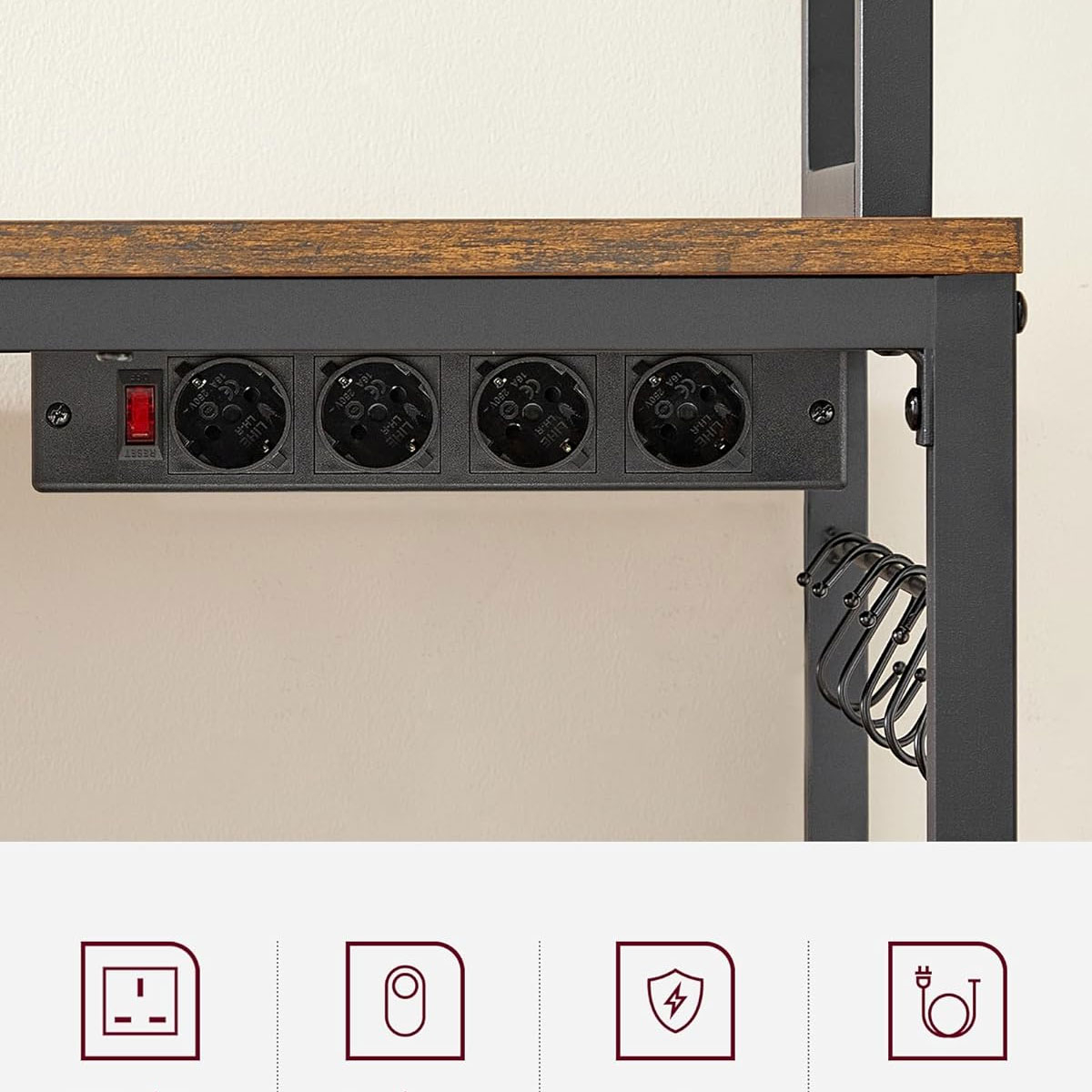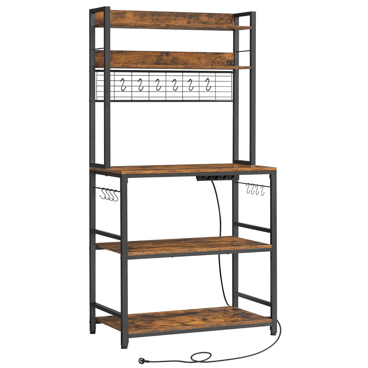Επιδαπέδια ραφιέρα με παροχή ρεύματος από την εταιρεία Vasagle σε καφέ ρουστίκ χρώμα και μαύρο σκελετό. Ιδανική για να την τοποθετήσετε σε οποιοδήποτε μέρος του σπιτιού όπως στην κουζίνα ή στο σαλόνι για να δώσει μοντέρνο ύφος. Το προϊόν έρχεται αμοντάριστο και συναρμολογείται βάσει οδηγιών.