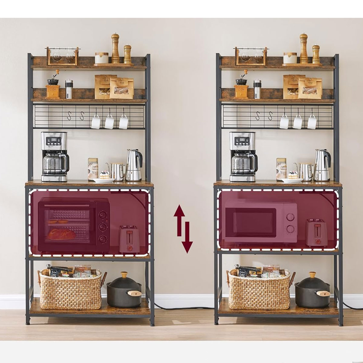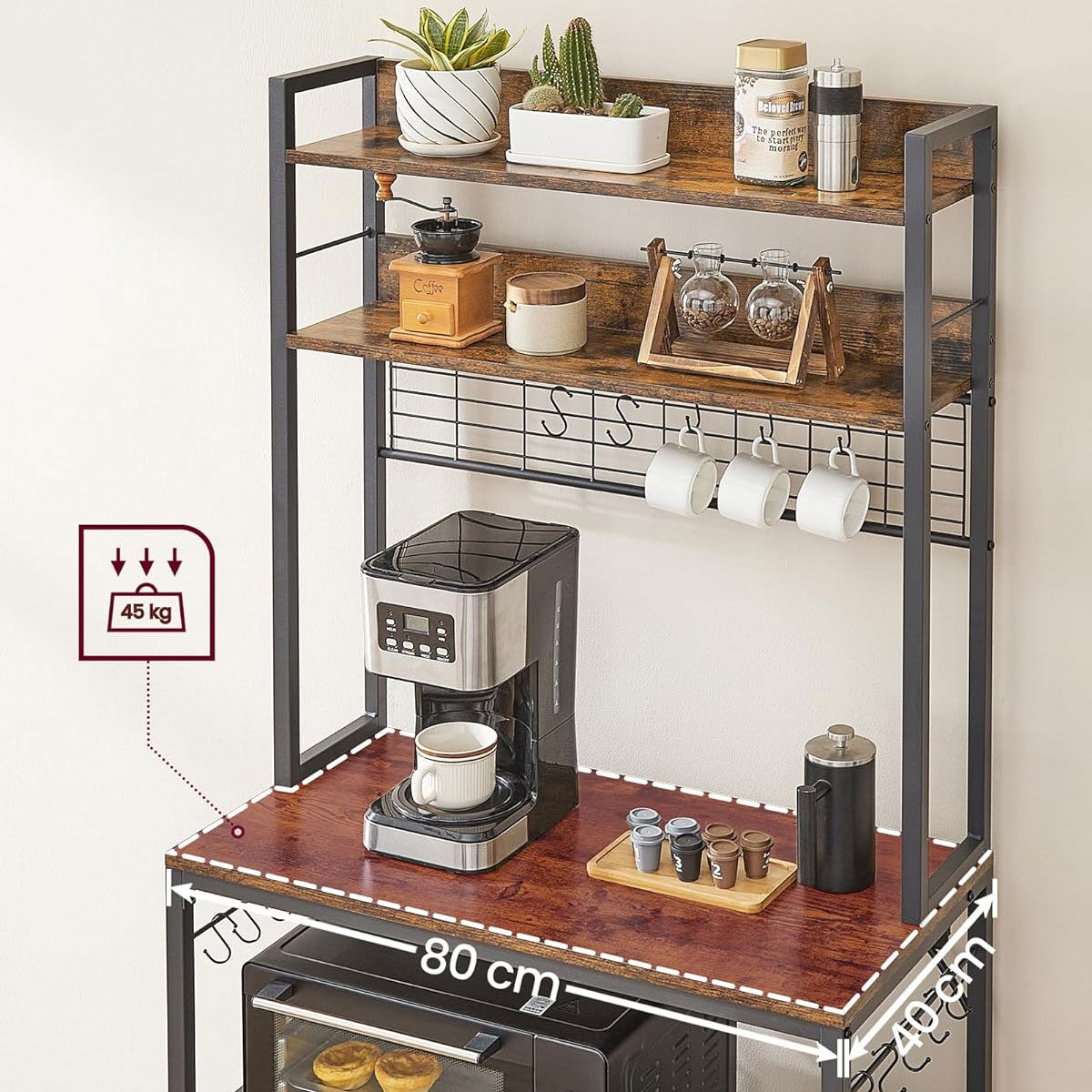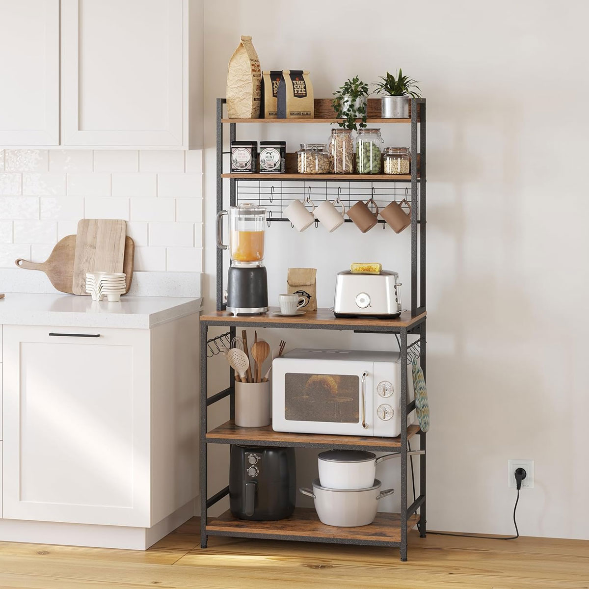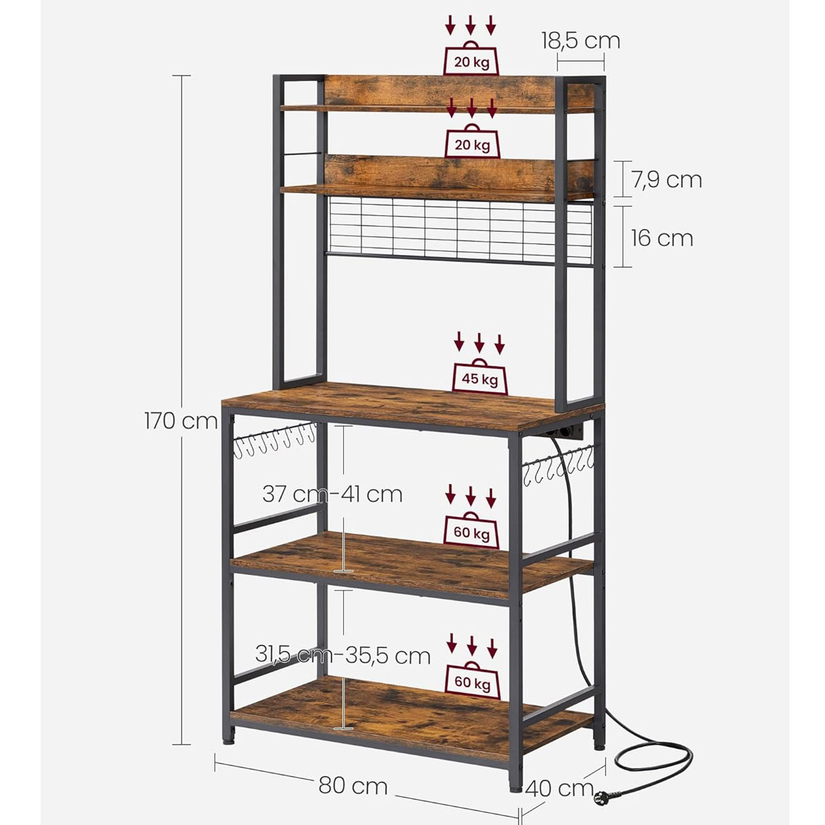 Επιδαπέδια ραφιέρα με παροχή ρεύματος από την εταιρεία Vasagle σε καφέ ρουστίκ χρώμα και μαύρο σκελετό. Ιδανική για να την τοποθετήσετε σε οποιοδήποτε μέρος του σπιτιού όπως στην κουζίνα ή στο σαλόνι για να δώσει μοντέρνο ύφος. Το προϊόν έρχεται αμοντάριστο και συναρμολογείται βάσει οδηγιών.