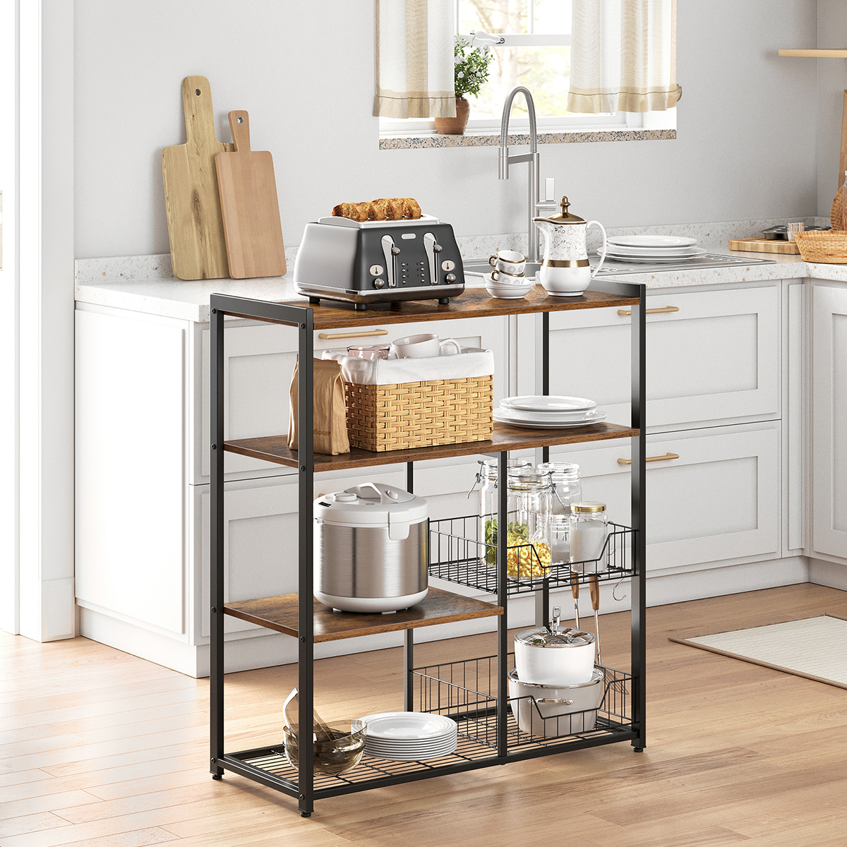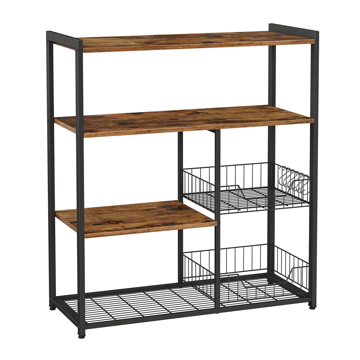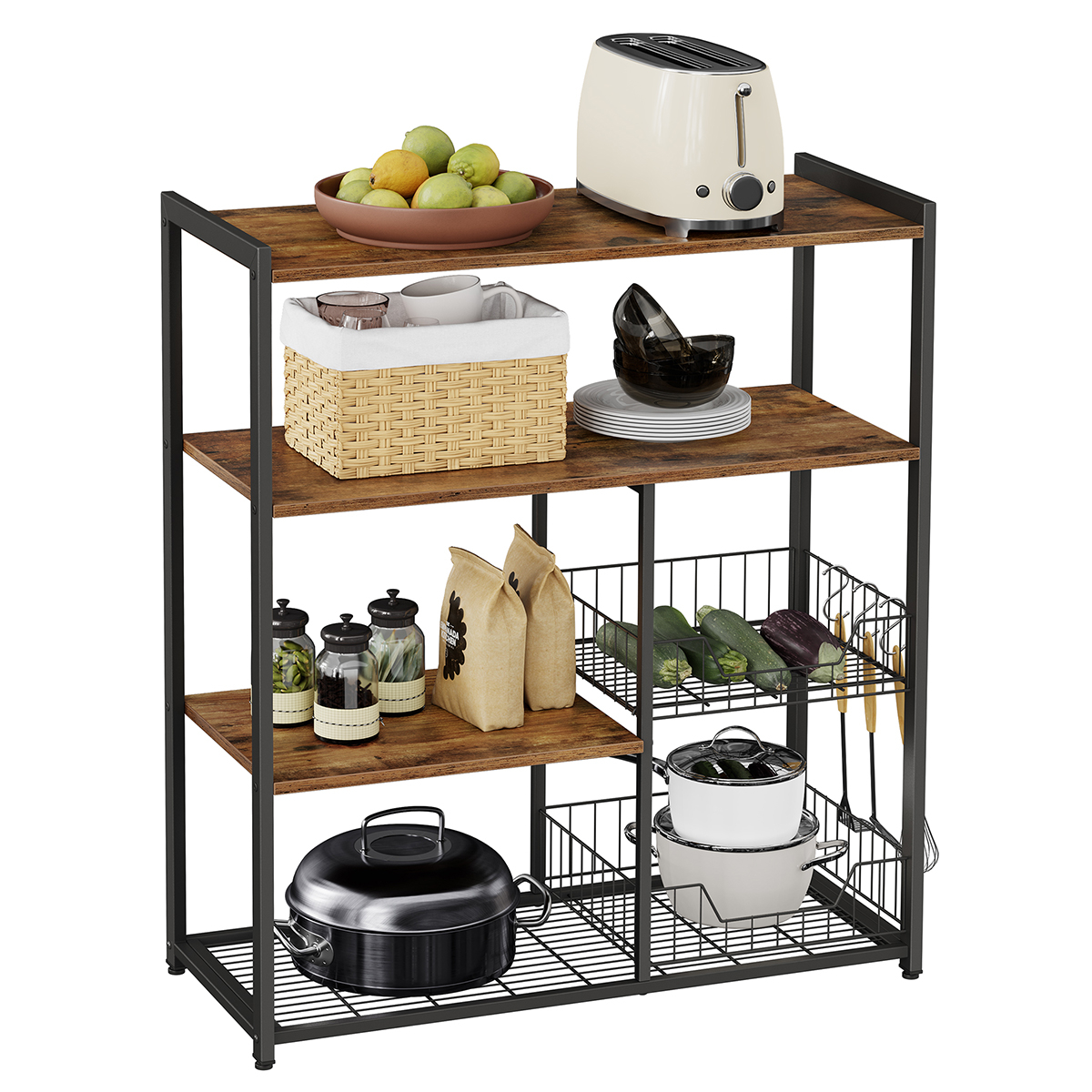Επιδαπέδια ραφιέρα 6 θέσεων από την εταιρεία Vasagle. Είναι κατασκευασμένη από μοριοσανίδα σε καφέ ρουστίκ χρώμα και μαύρο μεταλλικό σκελετό. Διαθέτει 2 μεγάλα ράφια και 4 μικρότερα για να τακτοποιήσετε τα πράγματα σας. Έχει 6 άγκιστρα που μπορείτε να χρησιμοποιήσετε σε όλα τα μεταλλικά πλέγματα και να κρεμάσετε πράγματα που θέλετε. Μπορεί να χρησιμεύσει και ως βοηθητικό έπιπλο κουζίνας. Τα πόδια διαθέτουν τάπες για να μην φθείρουν το πάτωμα και εξαρτήματα τοποθέτησης τοίχου για μέγιστη σταθερότητα. Καθαρίστε με ένα υγρό πανί και έπειτα σκουπίστε. *Το προϊόν έρχεται αμοντάριστο και συναρμολογείται βάσει οδηγιών.*