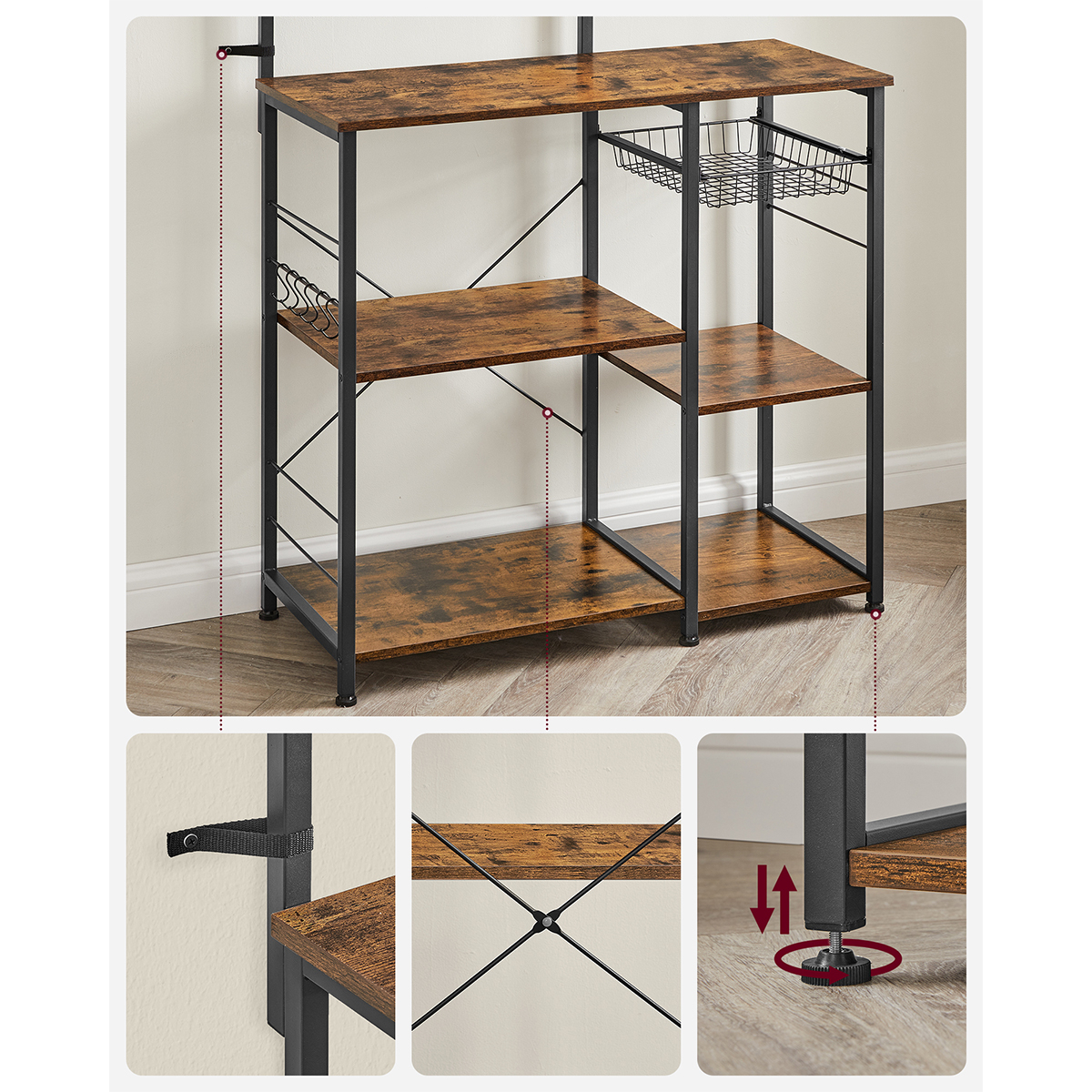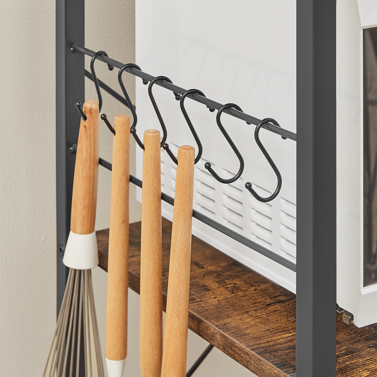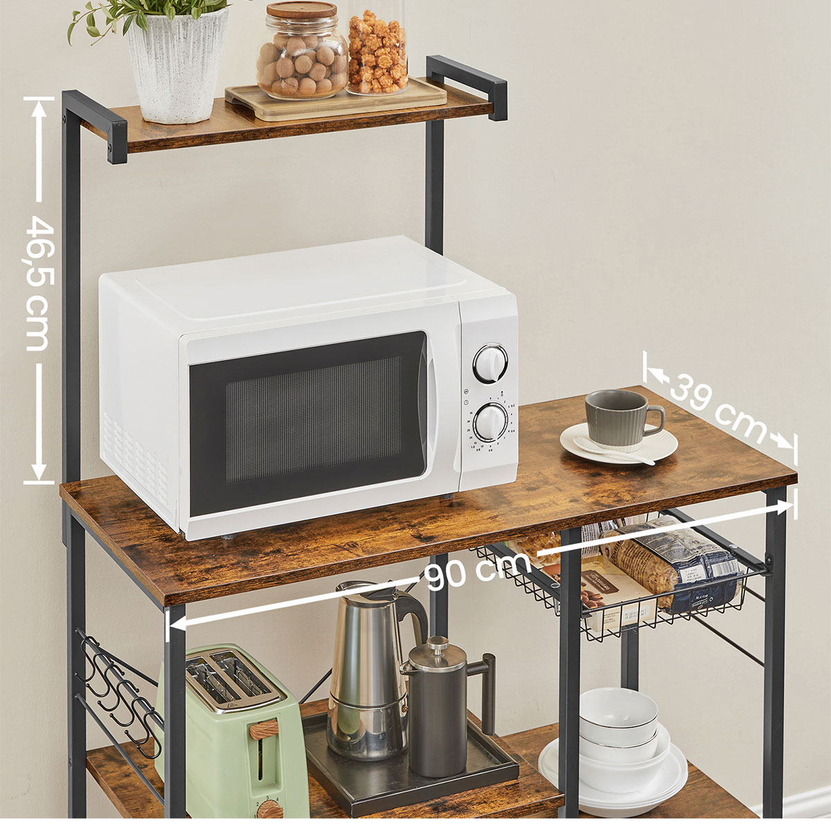 Επιδαπέδια ραφιέρα 6 θέσεων από την εταιρεία Vasagle. Είναι κατασκευασμένη από μοριοσανίδα σε μαύρο χρώμα με μεταλλικό σκελετό. Διαθέτει μία επιφάνεια, 5 ράφια, 6 άγκιστρα και ένα μεταλλικό συρτάρι. Ιδανικό βοηθητικό έπιπλο κουζίνας, για σκεύη και τον φούρνο μικροκυμάτων. Τα πόδια διαθέτουν τάπες για να μην φθείρουν το πάτωμα και εξαρτήματα τοποθέτησης τοίχου για μέγιστη σταθερότητα. Συνολικό μέγιστο βάρος αντοχής: 75kg. *Το προϊόν έρχεται αμοντάριστο και συναρμολογείται βάσει οδηγιών.*