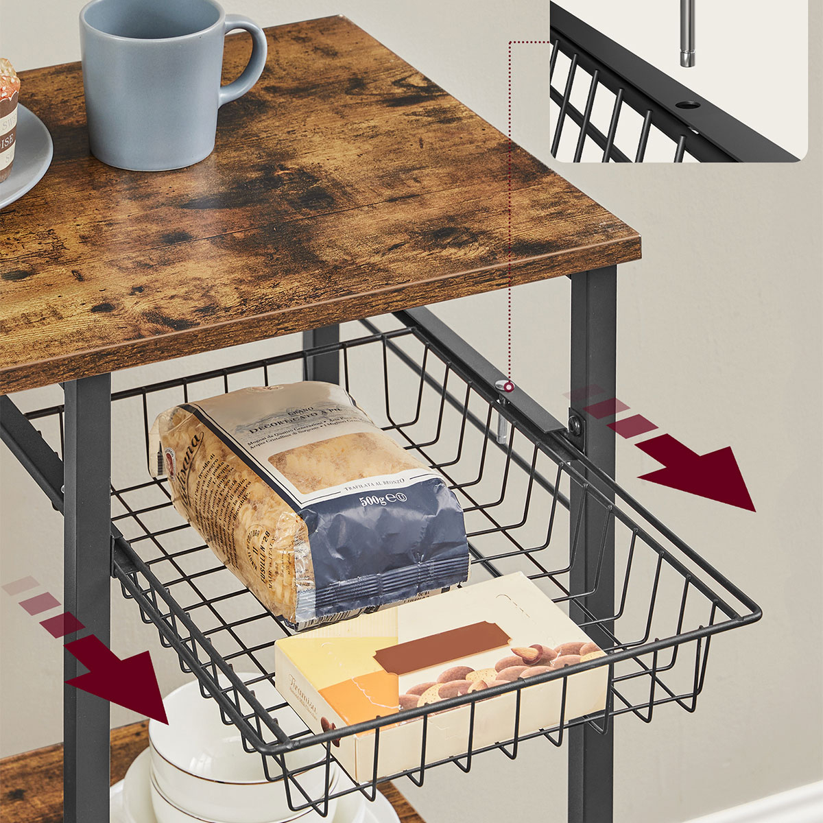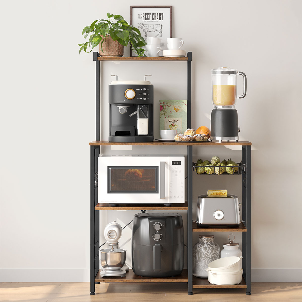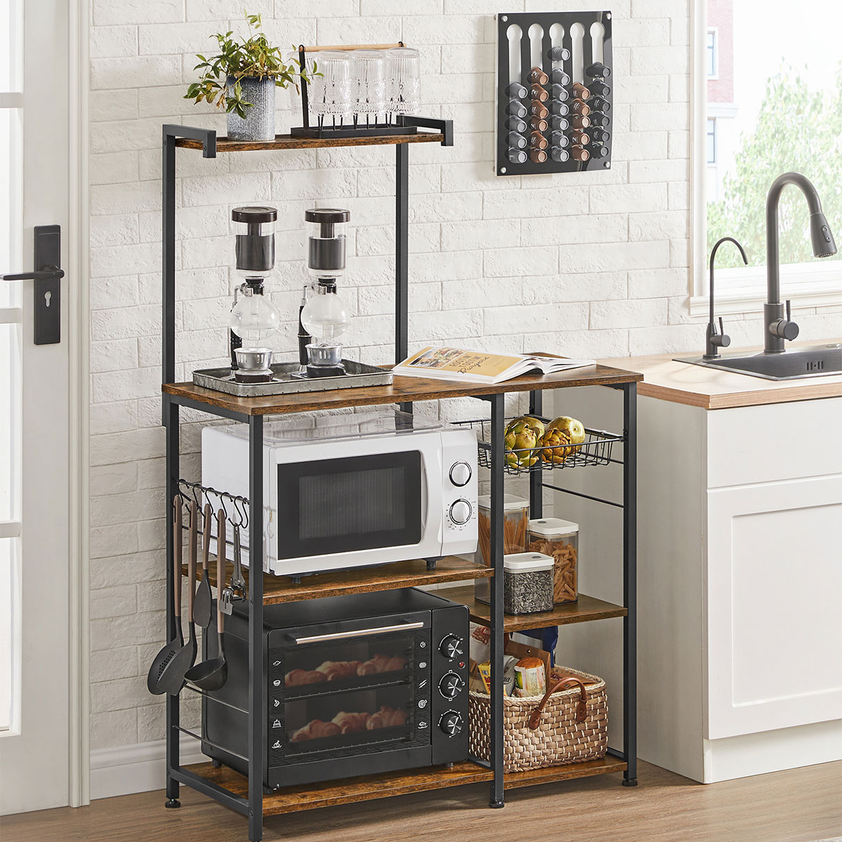 Επιδαπέδια ραφιέρα 6 θέσεων από την εταιρεία Vasagle. Είναι κατασκευασμένη από μοριοσανίδα σε μαύρο χρώμα με μεταλλικό σκελετό. Διαθέτει μία επιφάνεια, 5 ράφια, 6 άγκιστρα και ένα μεταλλικό συρτάρι. Ιδανικό βοηθητικό έπιπλο κουζίνας, για σκεύη και τον φούρνο μικροκυμάτων. Τα πόδια διαθέτουν τάπες για να μην φθείρουν το πάτωμα και εξαρτήματα τοποθέτησης τοίχου για μέγιστη σταθερότητα. Συνολικό μέγιστο βάρος αντοχής: 75kg. *Το προϊόν έρχεται αμοντάριστο και συναρμολογείται βάσει οδηγιών.*
