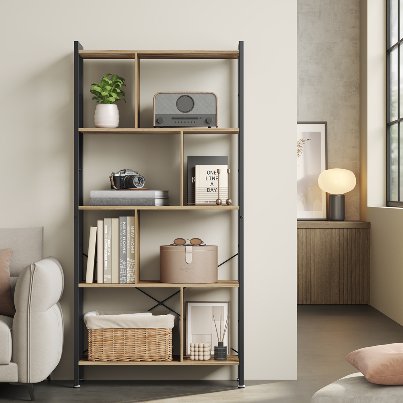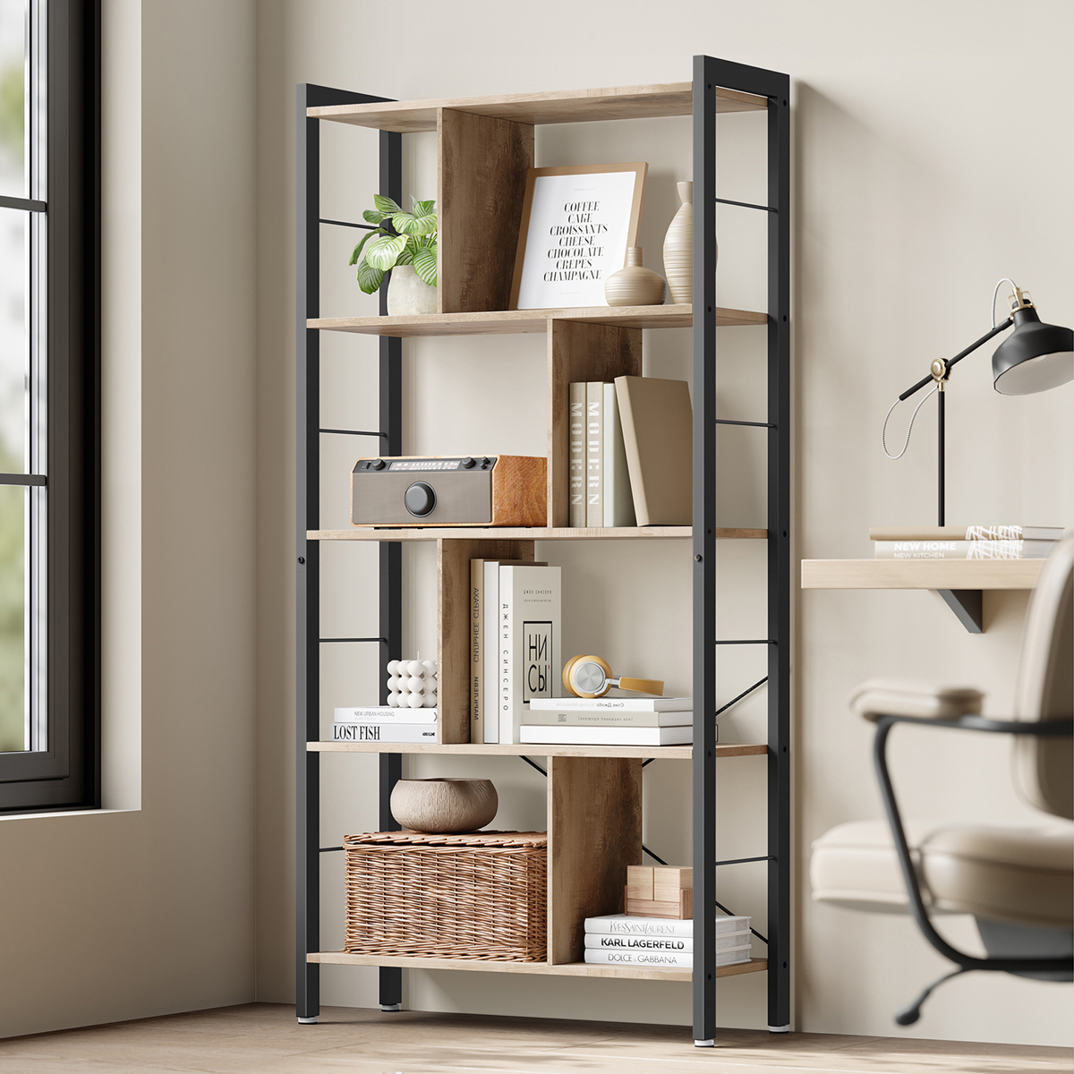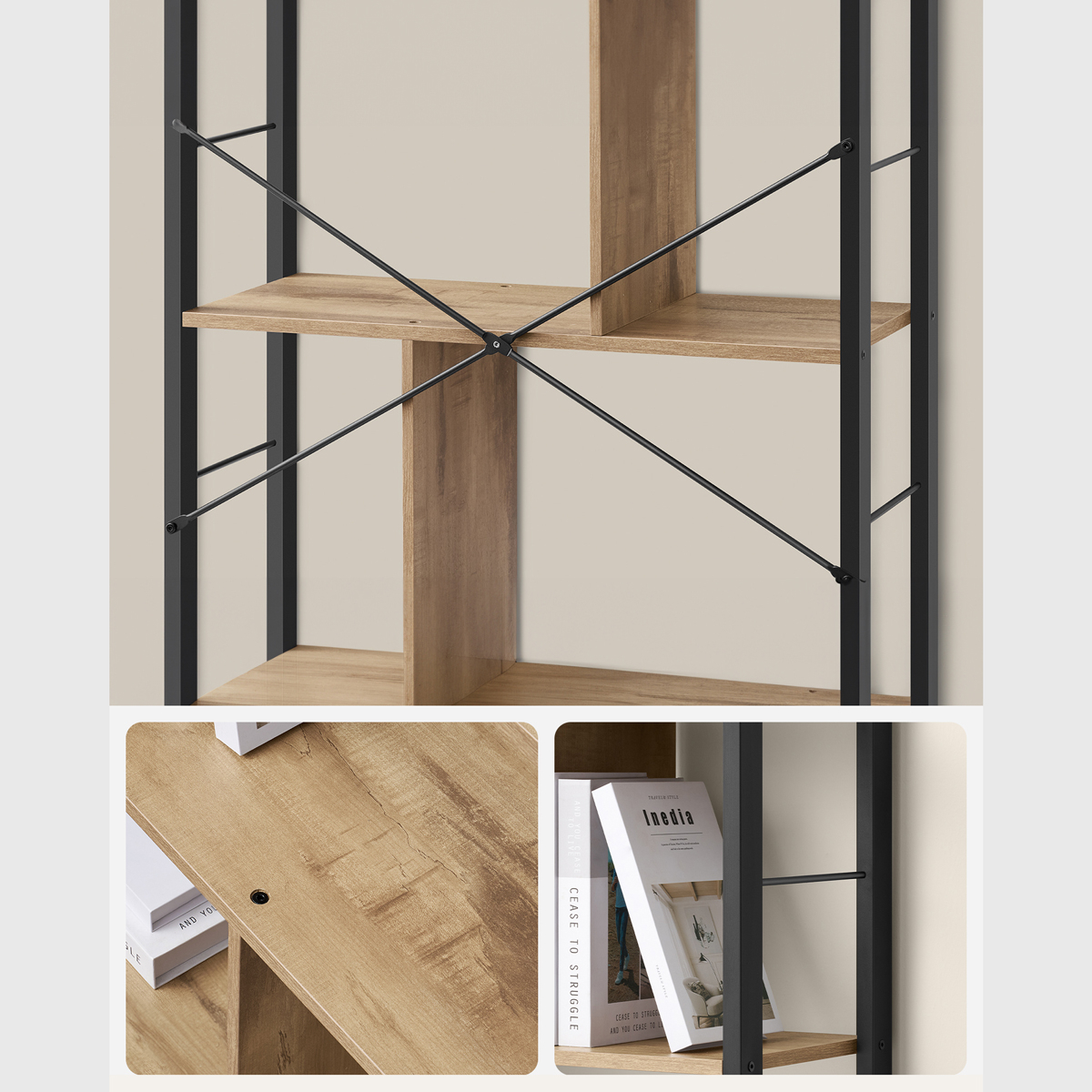 Επιδαπέδια ραφιέρα από την εταιρεία Vasagle, σε μπεζ χρώμα και μαύρο σκελετό. Διαθέτει χώρους για να τακτοποιήσετε τα βιβλία σας, τα διακοσμητικά σας ή ότι άλλο θέλετε. Ιδανική για να τοποθετηθεί σε οποιοδήποτε μέρος του σπιτιού όπως στην κρεβατοκάμαρα ή στο σαλόνι για να δώσει ένα μοντέρνο ύφος, τακτοποιώντας παράλληλα τα μικροπράγματα σας. Το προϊόν έρχεται αμοντάριστο και συναρμολογείται βάσει οδηγιών.