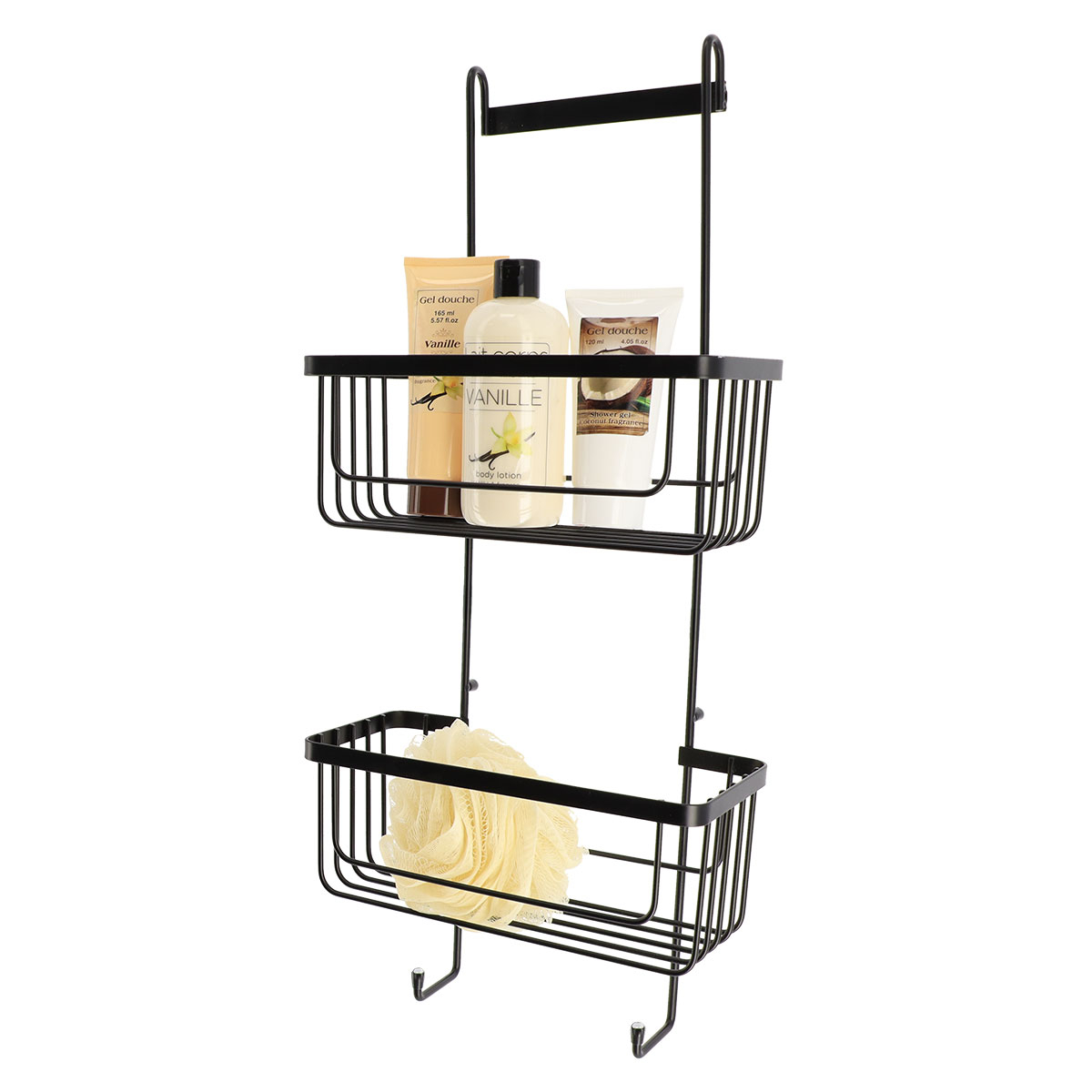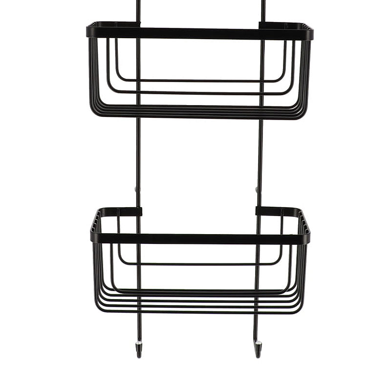 Ραφιέρα 2 θέσεων ιδανική για χρήση στην ντουζιέρα. Είναι κατασκευασμένη από ανοξείδωτο ατσάλι σε μαύρο χρώμα. Έχει δύο διάτρητες θήκες για να τοποθετείτε τα σαμπουάν, τα αφρόλουτρα ή ό,τι άλλο θέλετε να έχετε στο μπάνιο σας. Διαθέτει 2 γαντζάκια για τα σφουγγάρια και γάντζο για να κρεμιέται στο τζάμι του ντουζ.