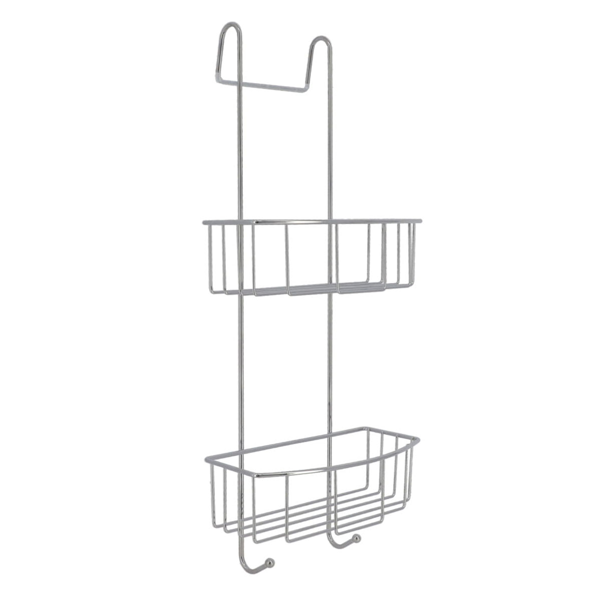 Ραφιέρα 2 θέσεων ιδανική για χρήση στην ντουζιέρα. Είναι κατασκευασμένη από ανθεκτικό μεταλλικό υλικό σε ασημί χρώμα. Έχει δύο διάτρητες θήκες για να τοποθετείτε τα σαμπουάν, τα αφρόλουτρα ή ό,τι άλλο θέλετε να έχετε στο μπάνιο σας. Διαθέτει 2 γαντζάκια για τα σφουγγάρια και γάντζο για να κρεμιέται στο τζάμι του ντουζ.
