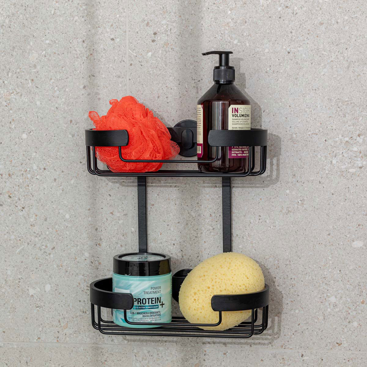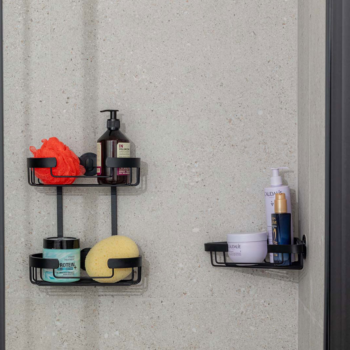 Ραφιέρα με 2 ράφια για την οργάνωση του μπάνιου με μοντέρνο σχεδιασμό από την εταιρεία εstia. Είναι κατασκευασμένη από αλουμίνιο. Διαθέτει αυτοκόλλητα διπλής όψης για να την κολλήσετε στον τοίχο χωρίς να χρειαστεί να τρυπήσετε. Μπορεί να κολλήσει εύκολα σε στεγνό και λείο τοίχο ή πλακάκι. Ιδανικό αξεσουάρ μπάνιου για να οργανώσετε τα σαμπουάν και τα μικροαντικείμενα.