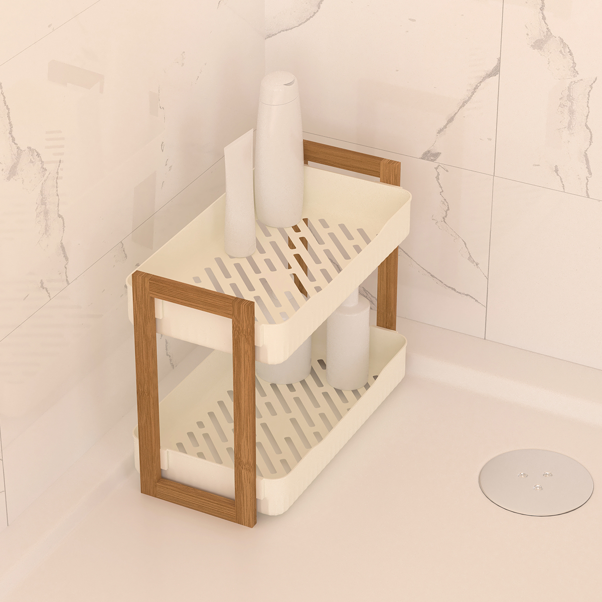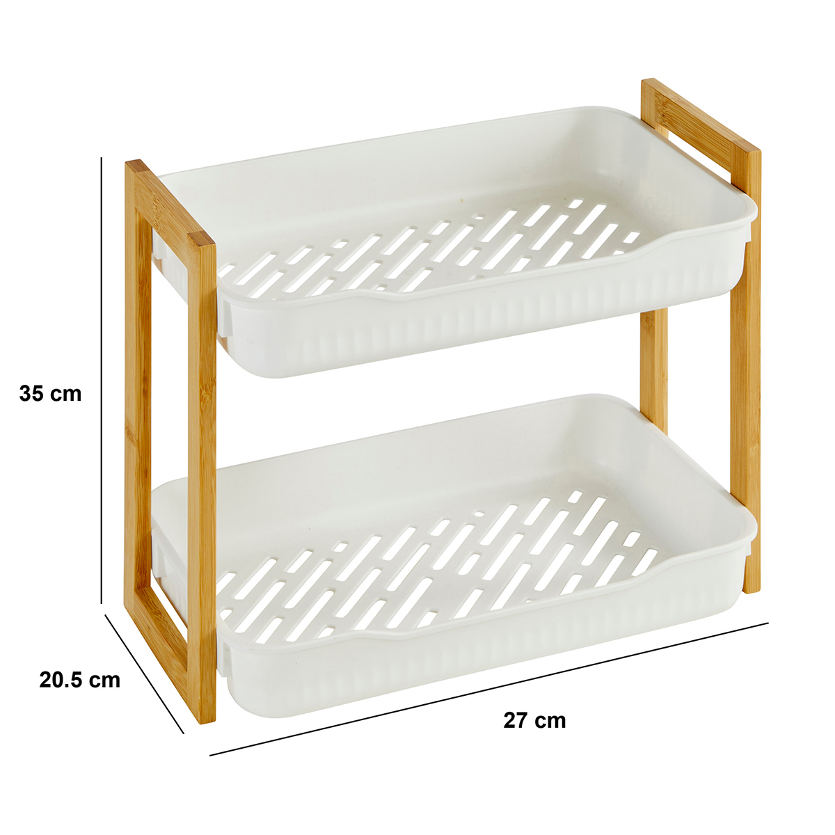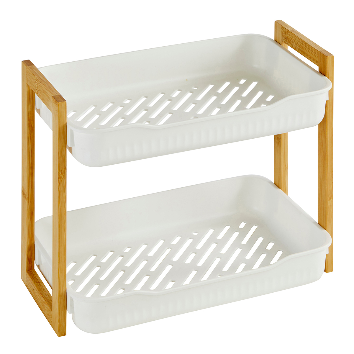 Ραφιέρα για την οργάνωση του μπάνιου σας με μοντέρνο σχεδιασμό. Είναι κατασκευασμένη από πλαστικό υλικό σε λευκό χρώμα και ξύλινο bamboo σκελετό. Διαθέτει 2 ράφια για να τακτοποιήσετε όλα τα απαραίτητα αντικείμενα του μπάνιου σας. Τα ράφια στο κάτω μέρος διαθέτουν τρυπούλες για να γίνεται αποστράγγιση του νερού. Συνδυάστε τη με τα υπόλοιπα είδη της ίδιας σειράς για ένα ολοκληρωμένο αποτέλεσμα.