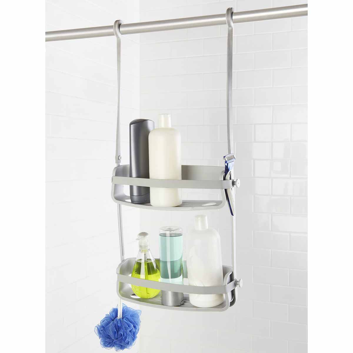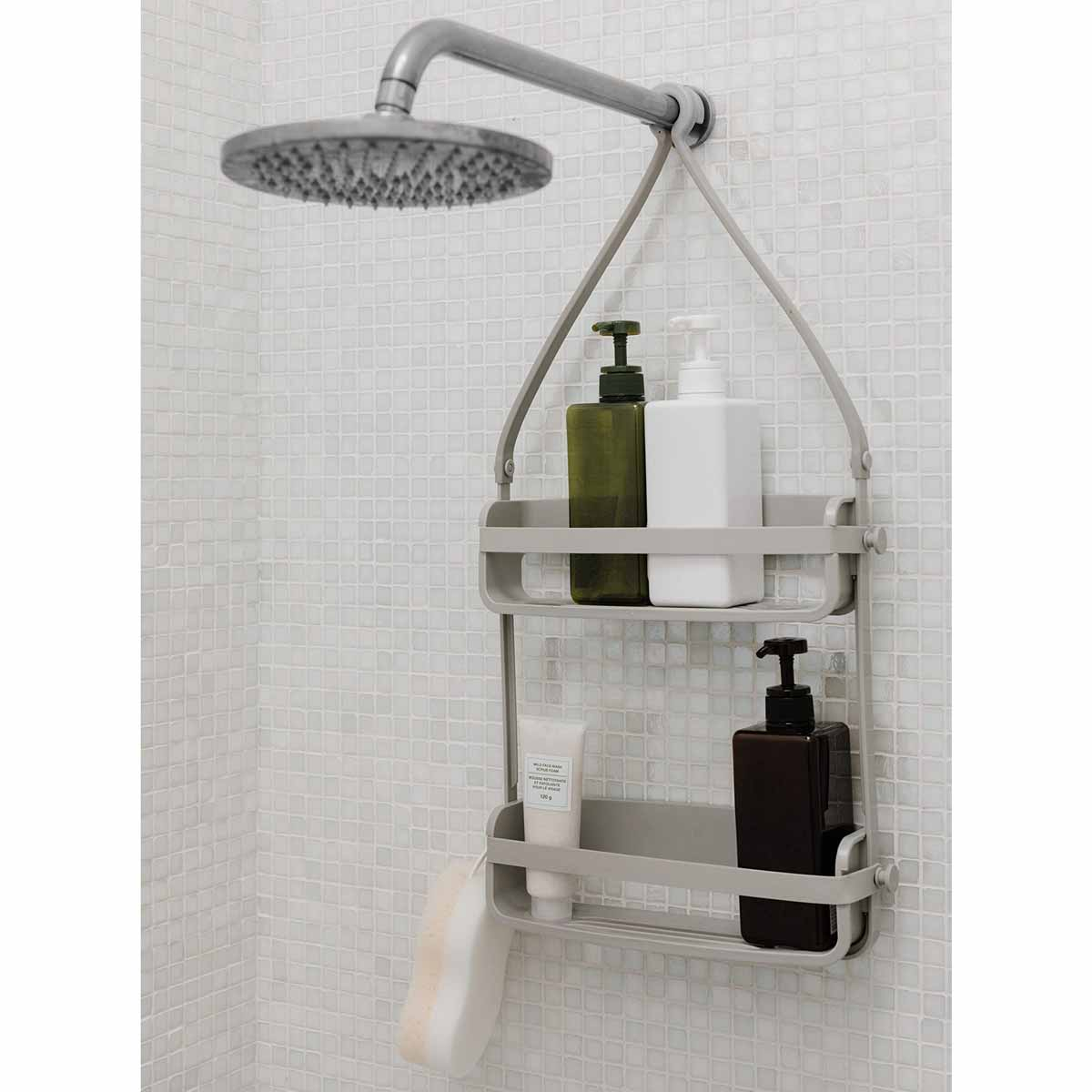 Ραφιέρα σε γκρι χρώμα ιδανική για χρήση στο μπάνιο από την εταιρεία Umbra. Είναι κατασκευασμένη από ανθεκτικό πλαστικό Abs. Έχει δύο ράφια και εύκαμπτες ταινίες από καουτσούκ για να τοποθετούνται και να συγκρατούνται τα μπουκάλια του αφρόλουτρου, του σαμπουάν κλπ. Κάθε ράφι έχει δύο τρύπες που επιτρέπουν στα μπουκάλια σαμπουάν να αποθηκεύονται με ανάποδη φορά (δηλαδή με το στόμιο προς τα κάτω), έτσι ώστε το υλικό να μπορεί να διανεμηθεί πιο εύκολα. Διαθέτει ένα ολοκληρωμένο σύστημα αποστράγγισης του νερού που αποτρέπει την δημιουργία υγρασίας και μούχλας. Μπορεί να κρεμαστεί στη βάση του ντουζ ή στον βραχίονας της κουρτίνας μπάνιου, καλύπτοντας ελάχιστο χώρο.
