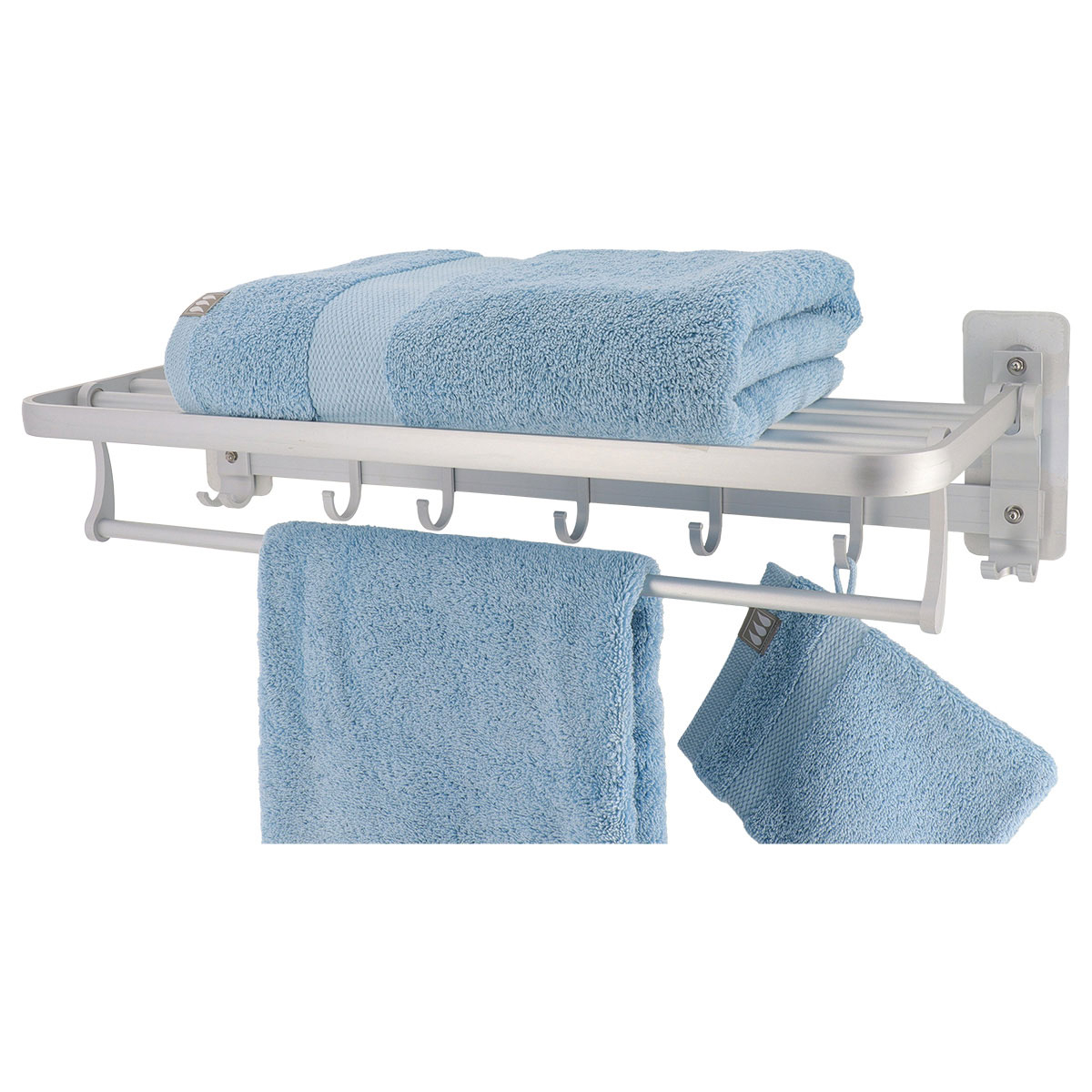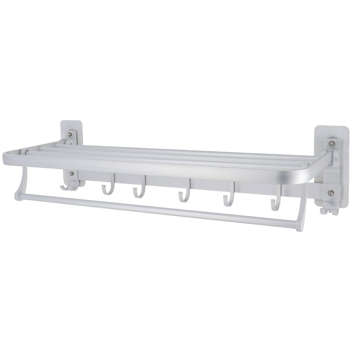 Ράφι μπάνιου με ενσωματωμένη κρεμάστρα πετσέτας και γαντζάκια. Είναι κατασκευασμένη από αλουμίνιο υψηλής ποιότητας σε ασημί χρώμα. Προσφέρει εξοικονόμηση χώρου, καθώς είναι ένα μοντέρνο ράφι τοίχου που εξασφαλίζει επιπλέον χώρο αποθήκευσης στο μπάνιο. Μπορεί να στερεωθεί με αυτοκόλλητο που περιλαμβάνεται ή με βίδες οι οποίες δεν περιλαμβάνονται. Μέγιστο βάρος αντοχής 3kg.