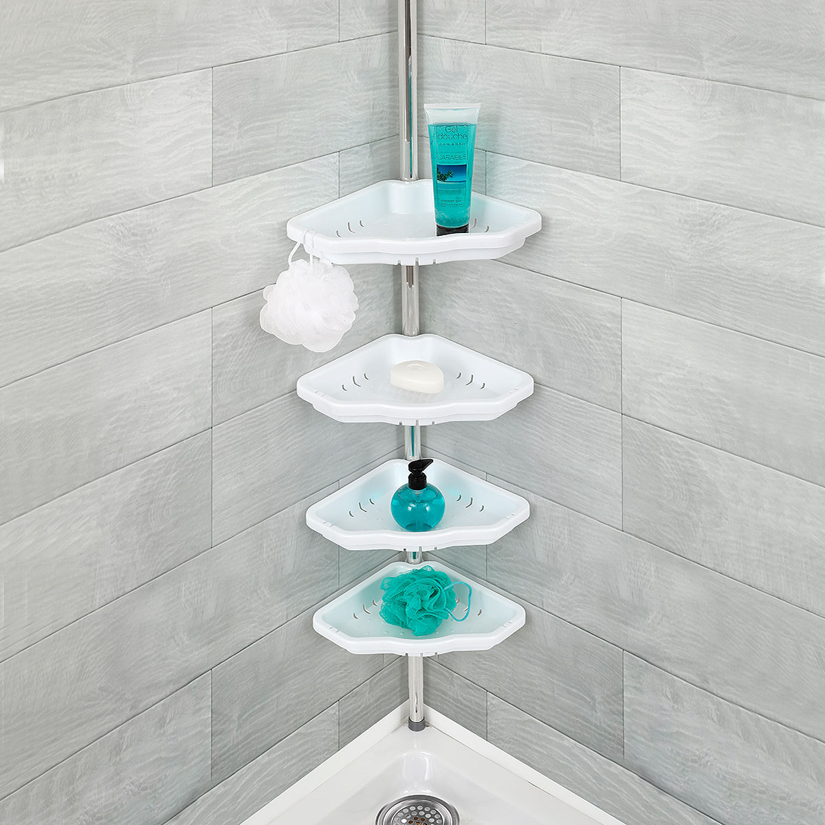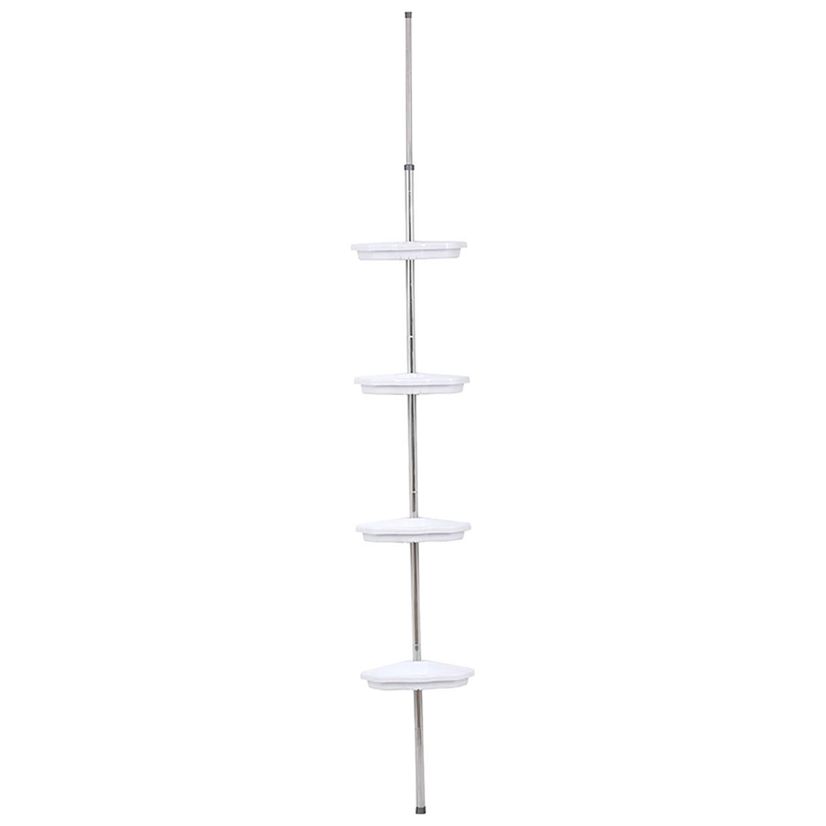 Ραφιέρα μπάνιου για τοποθέτηση στην γωνία της μπανιέρας ή της ντουζιέρας. Προσφέρει λύσεις αποθήκευσης και οργάνωσης για όλα τα αντικείμενα που χρησιμοποιείτε όσο κάνετε μπάνιο. Η ράβδος έχει ασημί χρώμα και είναι κατασκευασμένη από αλουμίνιο για να μην σκουριάζει. Διαθέτει 4 πλαστικά ράφια με ανοίγματα για να φεύγουν τα νερά και εσοχές για να κρεμάτε το σφουγγάρι σας. Τα ράφια μπορούν να τοποθετηθούν στο επιθυμητό ύψος. Είναι τηλεσκοπική καλύπτοντας ύψος 131-260cm.