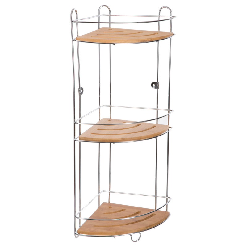 Γωνιακή ραφιέρα για την οργάνωση του μπάνιου με μοντέρνο σχεδιασμό. Είναι κατασκευασμένη από μέταλλο σε απόχρωση χρωμίου και ξύλο bamboo. Διαθέτει 3 ράφια για να τακτοποιήσετε όλα τα απαραίτητα αντικείμενα του μπάνιου σας.