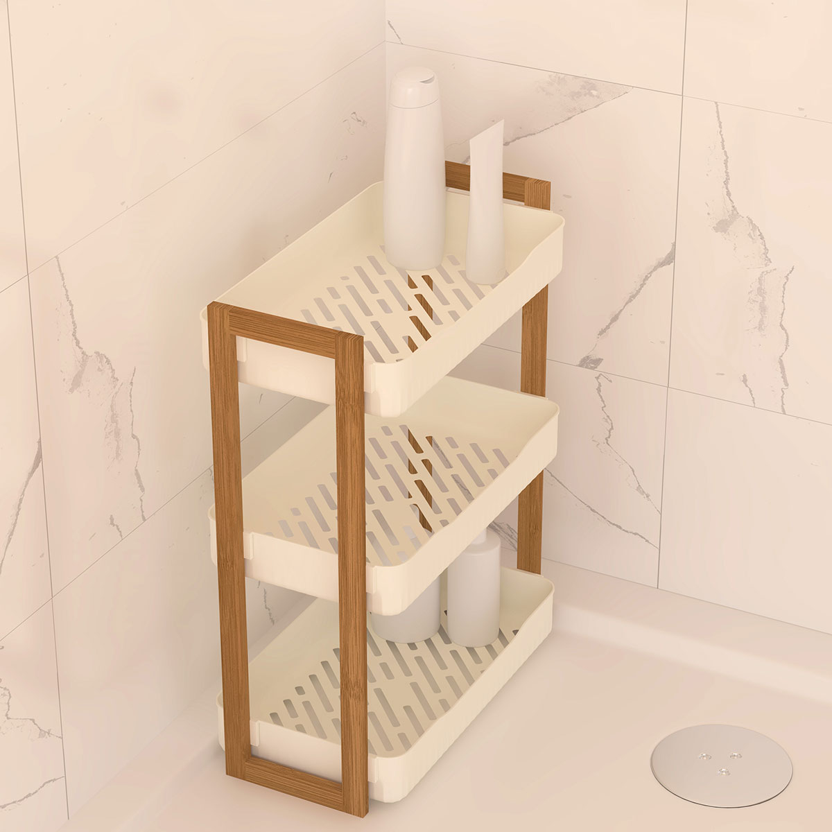 Ραφιέρα για την οργάνωση του μπάνιου με μοντέρνο σχεδιασμό. Είναι κατασκευασμένη από πλαστικό υλικό σε λευκό χρώμα και ξύλο bamboo. Διαθέτει 3 ράφια για να τακτοποιήσετε όλα τα απαραίτητα αντικείμενα του μπάνιου σας.