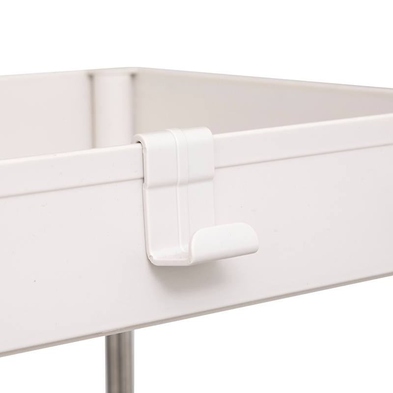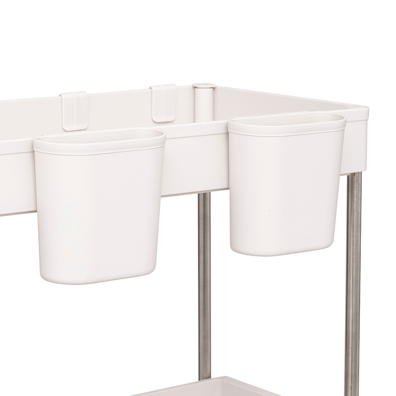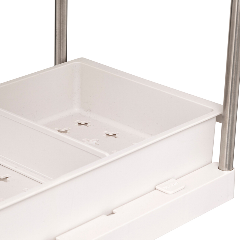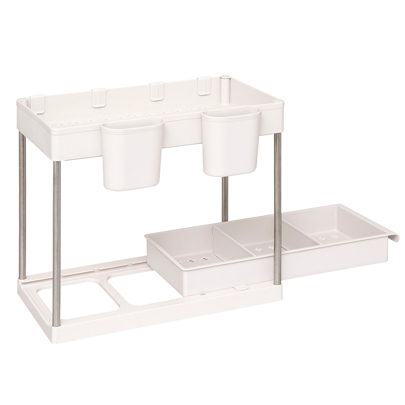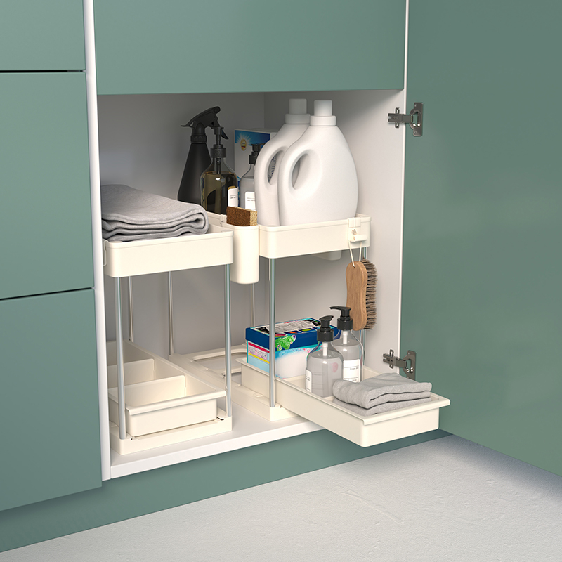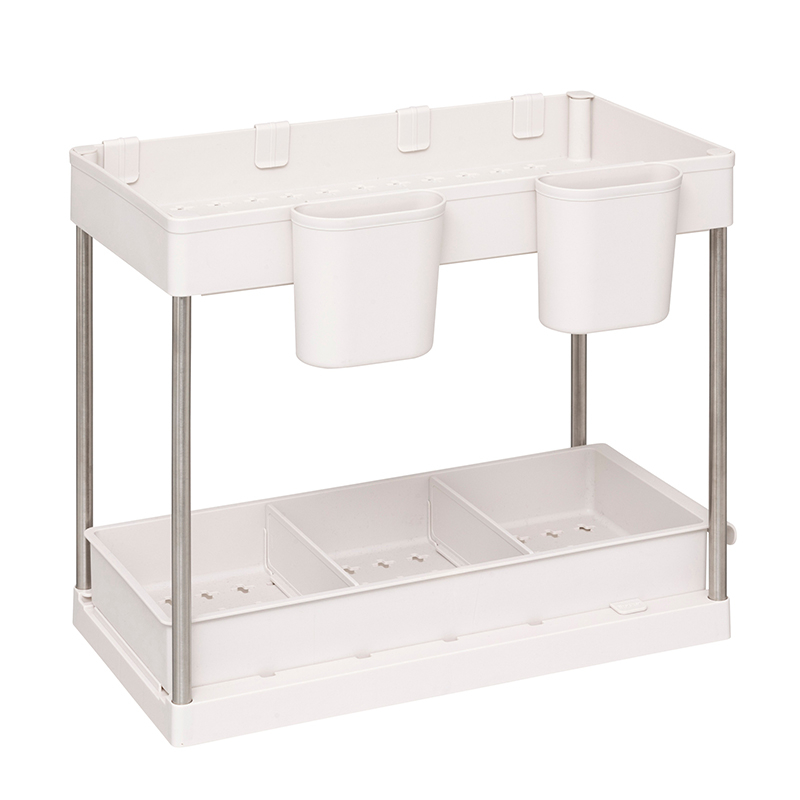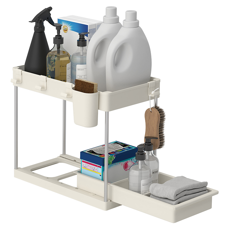 Ραφιέρα οργάνωσης 2 επιπέδων, ειδικά σχεδιασμένη για το ντουλάπι κάτω από τον νεροχύτη της κουζίνας. Είναι κατασκευασμένη από πλαστικό υλικό σε ιβουάρ χρώμα. Μπορείτε να αποθηκεύσετε σφουγγάρια και άλλα είδη οικιακής χρήσης ή ό,τι άλλο θέλετε. Το κάτω ράφι είναι συρόμενο, γεγονός που επιτρέπει την ευκολότερη πρόσβαση στα προϊόντα που είναι αποθηκευμένα εκεί. Περιλαμβάνονται δύο αφαιρούμενες θήκες και 4 γάντζοι. Μπορεί να τοποθετηθεί μέσα σε ντουλάπι στην κουζίνα, το μπάνιο και όπου αλλού είναι απαραίτητη ή μπορεί να τοποθετηθεί πάνω στον πάγκο δημιουργώντας πρόσθετο αποθηκευτικό χώρο.