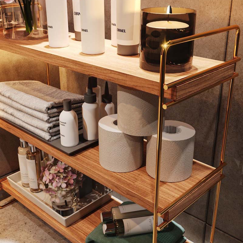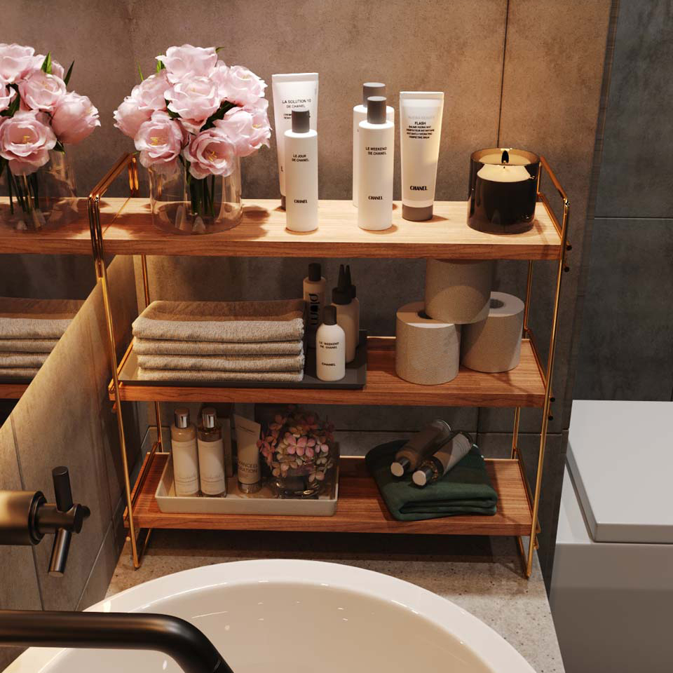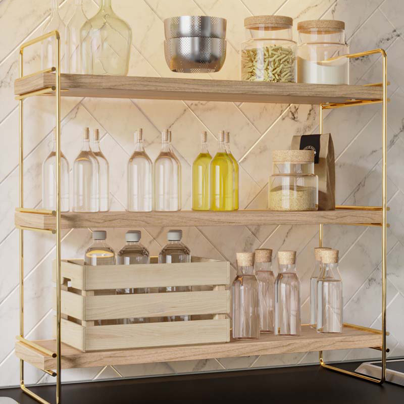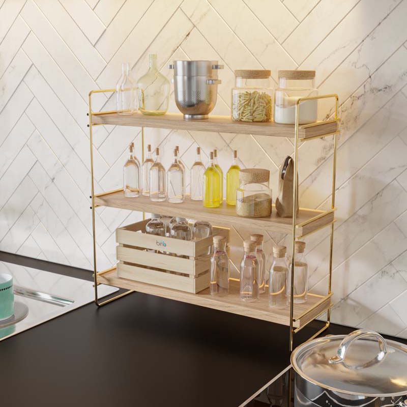 Ράφι οργάνωσης 3 ορόφων με μοντέρνο σχεδιασμό σε φυσική απόχρωση ξύλου. Είναι κατασκευασμένο από φυσικό ξύλο και έχει μεταλλικές λεπτομέρειες σε χρυσό χρώμα. Κατάλληλη για την κουζίνα, το μπάνιο το γραφείο ή οποιοδήποτε άλλο χώρο. Μέγιστο βάρος αντοχής: 6 kg. Λόγω του φυσικού υλικού, η απόχρωση του ξύλου μπορεί να διαφέρει από την φωτογραφία. *Περιλαμβάνονται τα υλικά τοποθέτησης.*