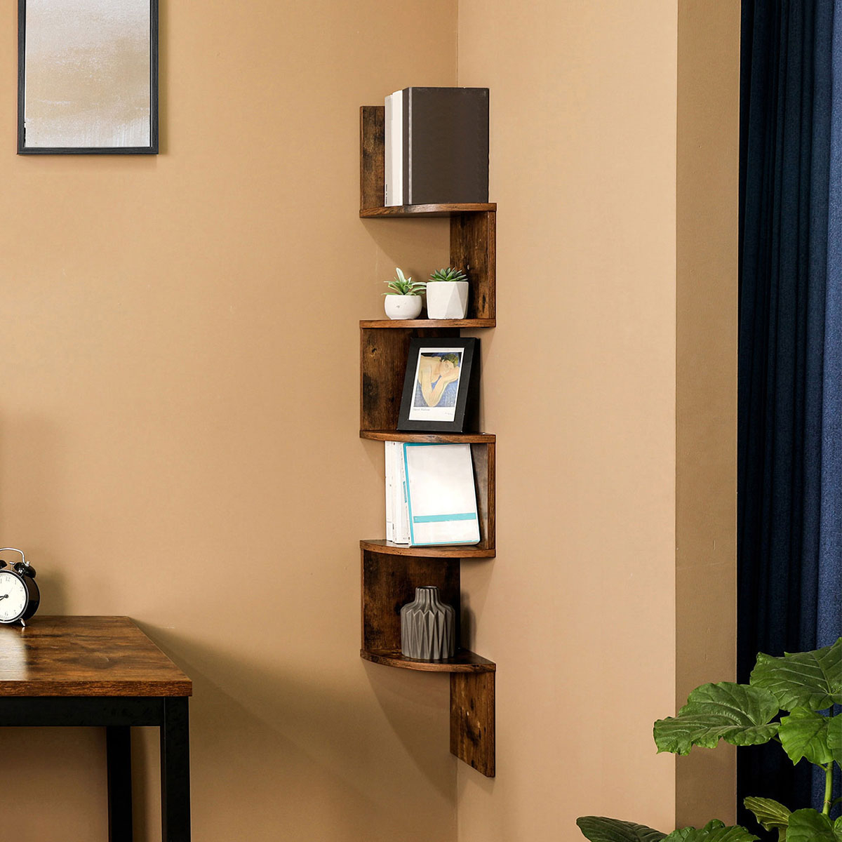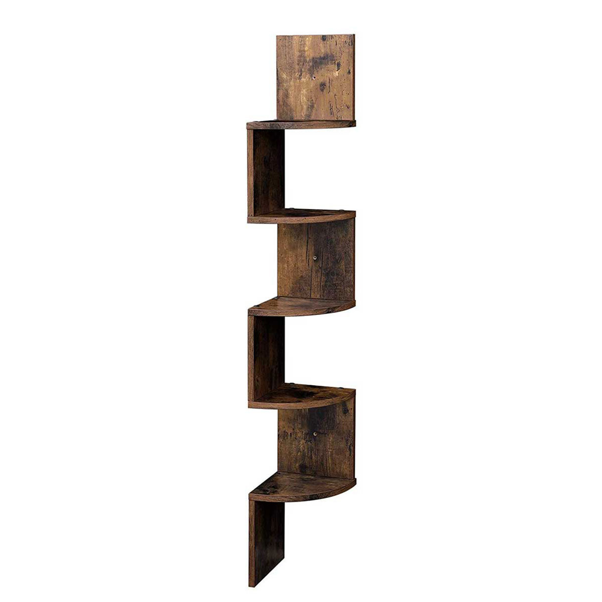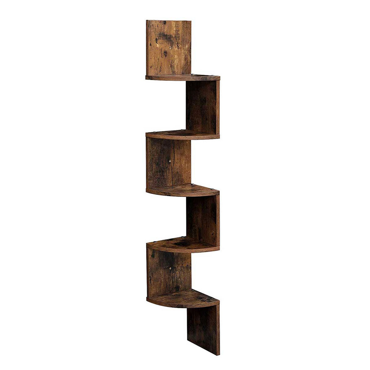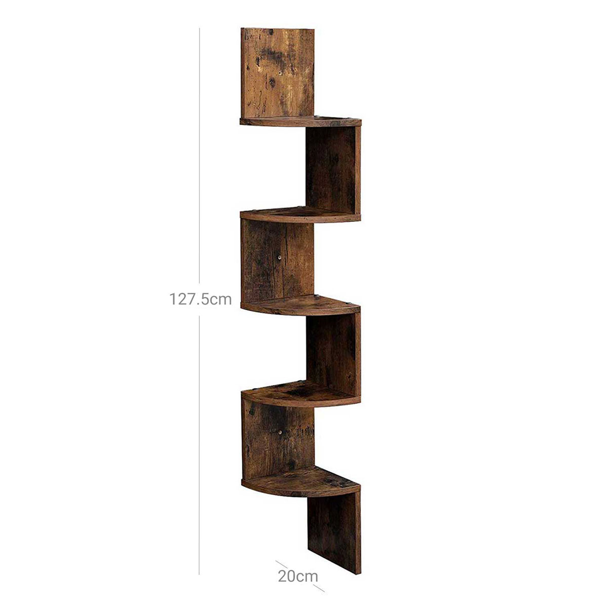 Γωνιακή βιβλιοθήκη τοίχου 5 θέσεων από την εταιρεία Vasagle. Είναι κατασκευασμένη από μοριοσανίδα και μελαμίνη σε καφέ ρουστίκ χρώμα. Ιδανική για να τοποθετηθεί σε οποιοδήποτε μέρος του σπιτιού για να δώσει ένα μοντέρνο ύφος, τακτοποιώντας παράλληλα τα μικροπράγματα σας, τα βιβλία σας ή ό,τι άλλο θέλετε. Μπορείτε να το τοποθετήσετε επίσης στην κουζίνα σας για να κάνετε ένα έξτρα ράφι για τα βάζα και τα μπαχαρικά. Διαθέτει εξαρτήματα εγκατάστασης τοίχου για μεγαλύτερη σταθερότητα και είναι ανθεκτικό στις γρατσουνιές και στη φθορά. Το κάθε ράφι έχει μέγιστο βάρος αντοχής 10kg. Καθαρίστε τα ράφια με ένα υγρό πανί και έπειτα σκουπίστε. *Το προϊόν έρχεται αμοντάριστο και συναρμολογείται βάσει οδηγιών.*