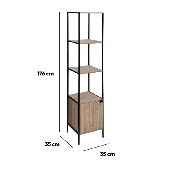 Επιδαπέδια ραφιέρα κσε φυσικό χρώμα ξύλου με μαύρο σκελετό. Διαθέτει ράφια στα οποία μπορείτε να τοποθετήσετε διάφορα πράγματα ή κουτιά αποθήκευσης και ντουλάπι με λαβή. Το προϊόν έρχεται αμοντάριστο και συναρμολογείται βάσει οδηγιών.