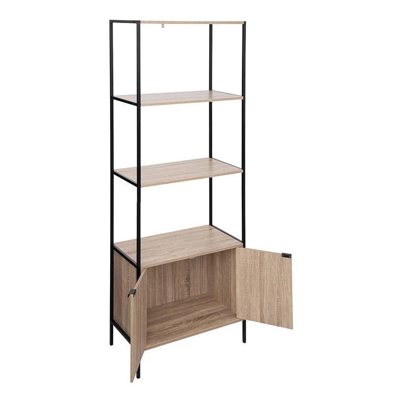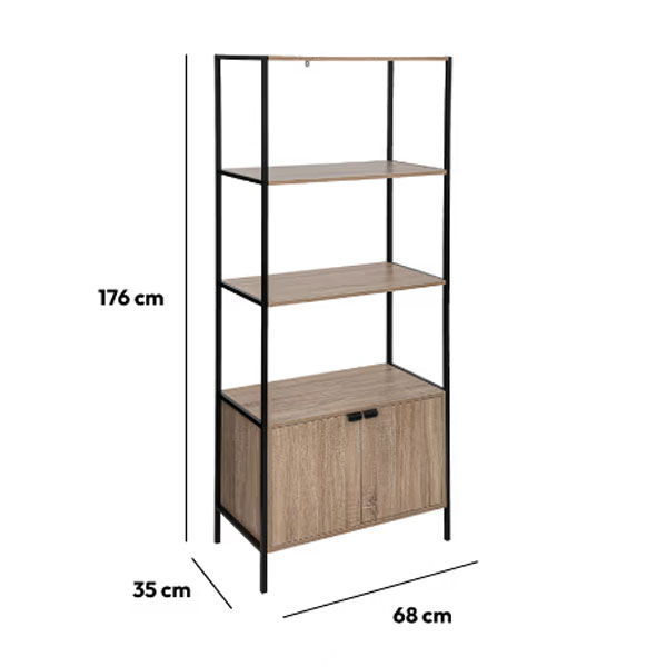 Επιδαπέδια ραφιέρα κατασκευασμένη σε φυσικό χρώμα με μαύρο σκελετό. Διαθέτει χώρους στους οποίους μπορείτε να τοποθετήσετε διάφορα πράγματα ή κουτιά αποθήκευσης. Το προϊόν έρχεται αμοντάριστο και συναρμολογείται βάσει οδηγιών.