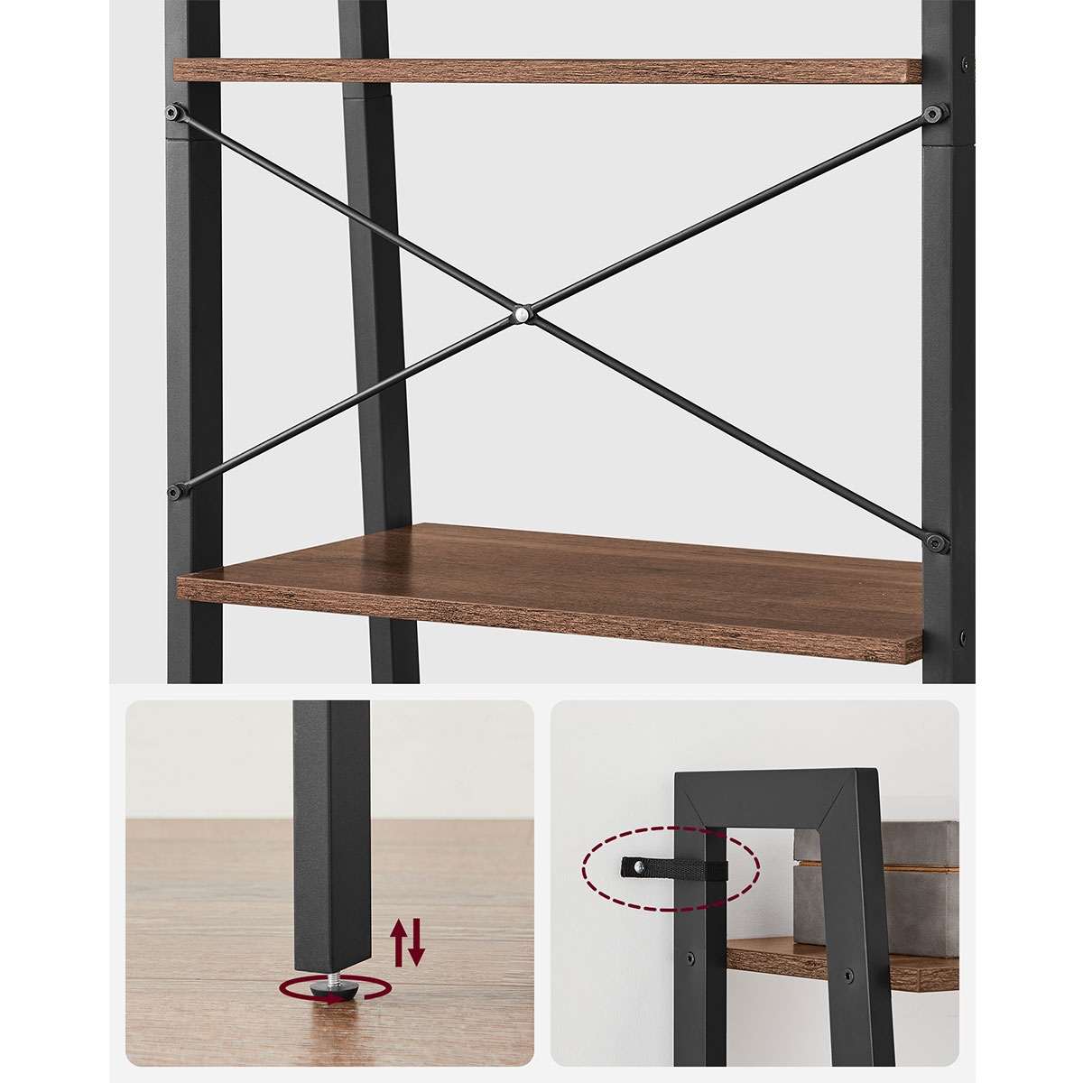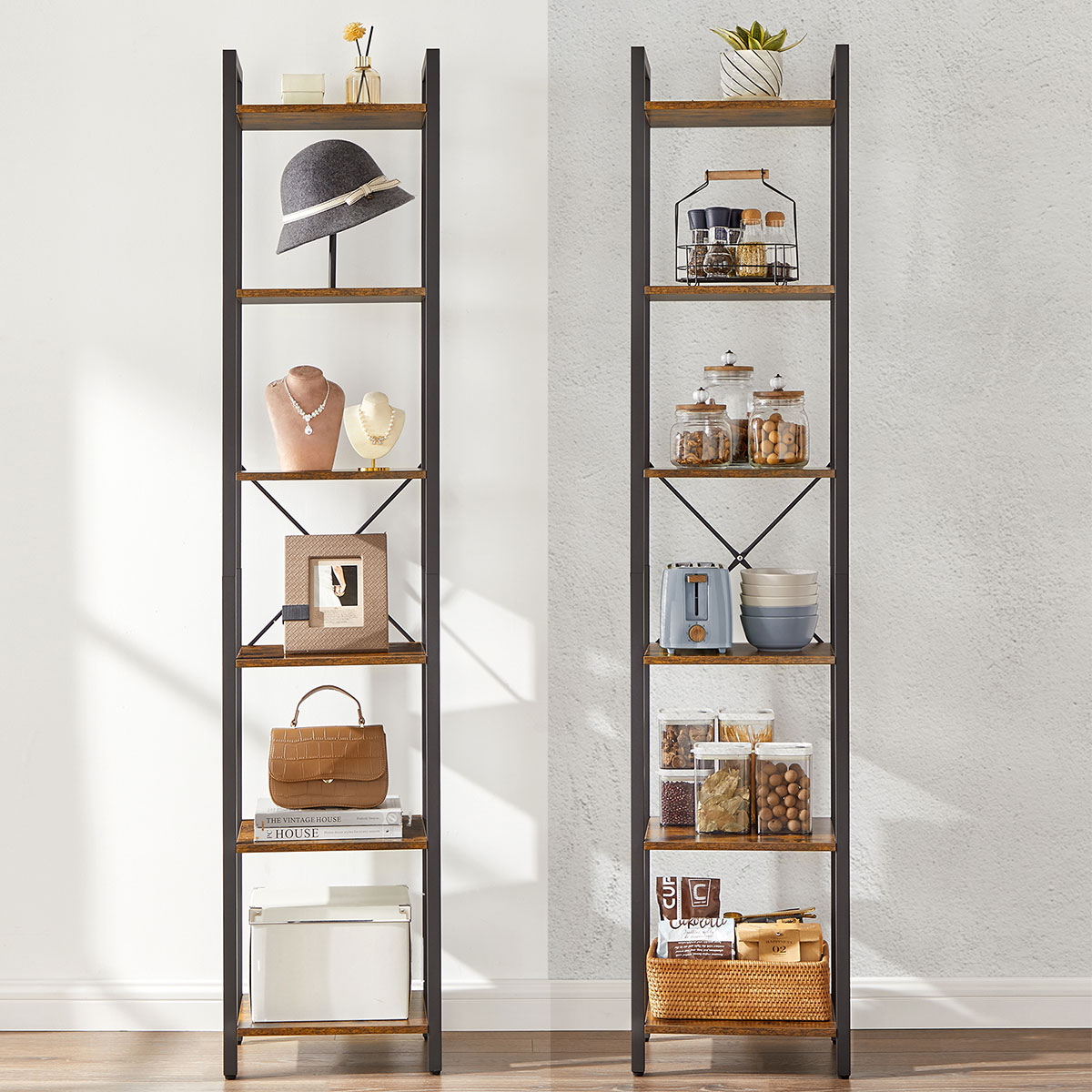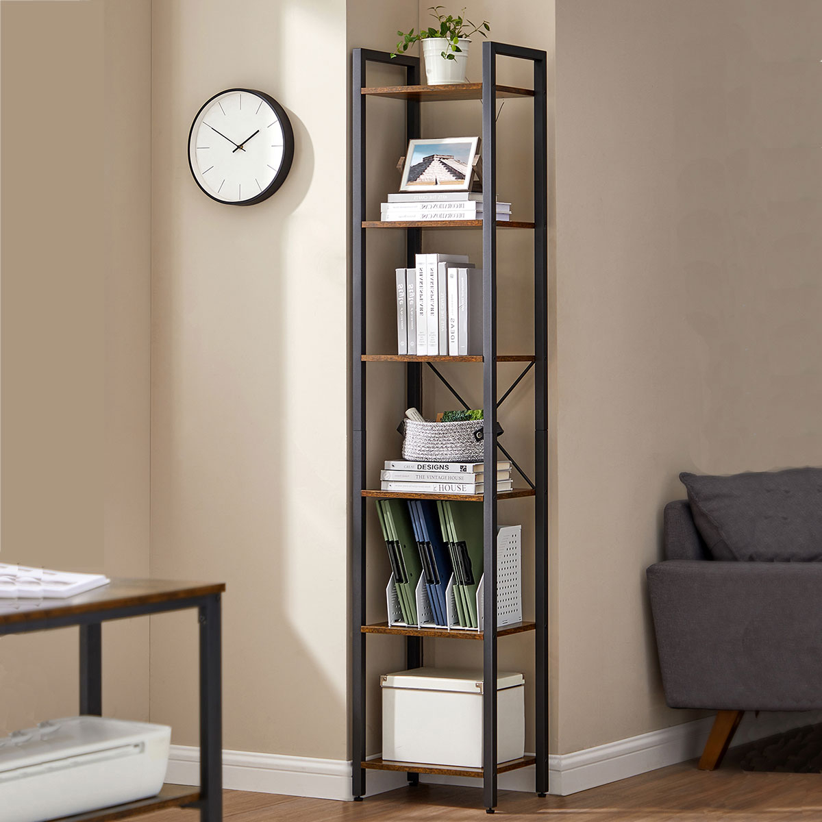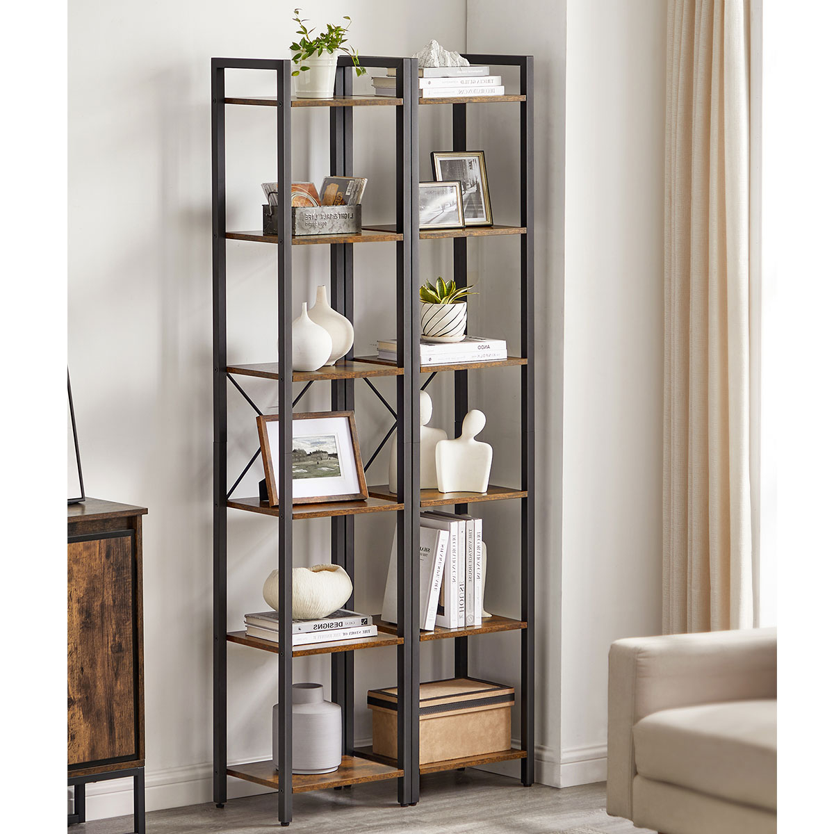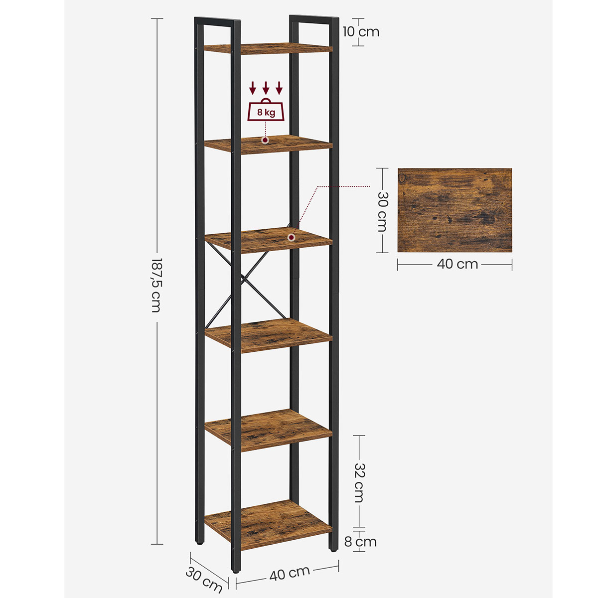 Ραφιέρα με 6 θέσεις από την εταιρεία Vasagle. Είναι κατασκευασμένη από μοριοσανίδα σε καφέ ρουστίκ χρώμα και διαθέτει μεταλλικό σκελετό. Ιδανική για να τοποθετηθεί στη κρεβατοκάμαρα ή στο σαλόνι και να δώσει ένα μοντέρνο ύφος, τακτοποιώντας παράλληλα τα μικροπράγματα σας, τα βιβλία σας ή ό,τι άλλο θέλετε. Διαθέτει εξαρτήματα εγκατάστασης τοίχου για μεγαλύτερη σταθερότητα και είναι ανθεκτική στις γρατσουνιές και στη φθορά. Έχει μέγιστο βάρος αντοχής 50kg. Καθαρίστε τα ράφια με ένα υγρό πανί και έπειτα σκουπίστε. *Το προϊόν έρχεται αμοντάριστο και συναρμολογείται βάσει οδηγιών.*