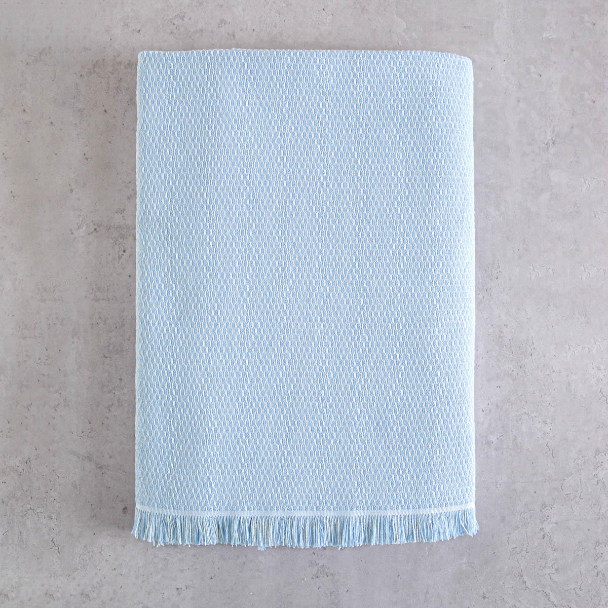 Ριχτάρι για διθέσιο καναπέ της εταιρείας Rythmos σε γαλάζιο χρώμα με λευκές λεπτομέρειες και μοντέρνο σχέδιο. Το ζακάρ ύφασμα από 80% βαμβάκι και 20% polyester το καθιστά ιδανικό για όλους τους μήνες του χρόνου. Διαθέτει κρόσια στο τελείωμα. Συνδυάστε το με τις υπόλοιπες διαστάσεις του ίδιου σχεδίου για ένα ολοκληρωμένο αποτέλεσμα.