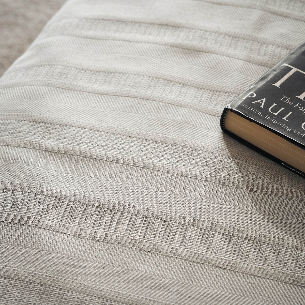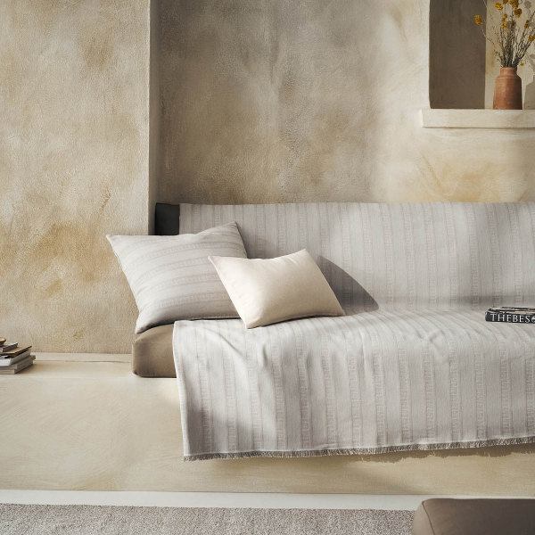 Ριχτάρι για τον διθέσιο καναπέ από την εταιρεία Gofis Home σε ανοιχτή γκρι απόχρωση με κοντό κρόσσι. Στην ύφανση σχηματίζει ριγέ ανάγλυφο σχέδιο. Είναι κατασκευασμένο από 80% βαμβάκι και 20% polyester, με ευχάριστη αίσθηση στην αφή και ανθεκτικότητα. Ιδανικό για όλες τις εποχές του χρόνου. Για ένα αρμονικό αποτέλεσμα στο σαλόνι σας συνδυάστε το με τα υπόλοιπα είδη του ίδιου σετ.