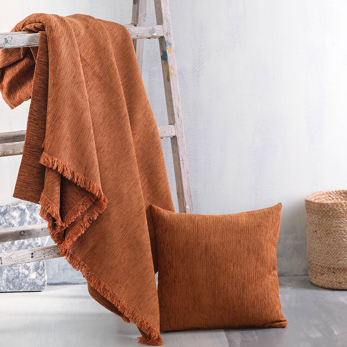 Ριχτάρι για τον διθέσιο καναπέ στο χρώμα της τερακότας από την εταιρία Rythmos. Είναι κατασκευασμένο από 55% chenille, 25% βαμβάκι και 20% polyester, με ζακάρ ύφανση, που το καθιστά ιδανικό για τους χειμερινούς μήνες. Διαθέτει διακοσμητικά κρόσια στο τελείωμα. Συνδυάστε το με τα υπόλοιπα είδη της ίδιας σειράς για ένα ολοκληρωμένο σετ.