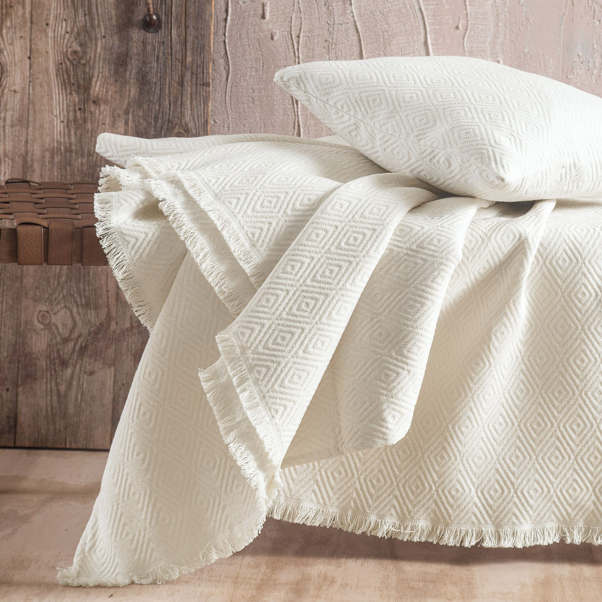 Ριχτάρι για τον διθέσιο καναπέ σε εκρού χρώμα, με ανάγλυφο μοντέρνο σχέδιο από την εταιρεία Rythmos. Είναι κατασκευασμένο από ζακάρ ύφασμα σύνθεσης 80% βαμβάκι και 20% polyester, που το καθιστά ιδανικό για όλους τους μήνες του χρόνου. Διαθέτει κρόσσια στο τελείωμα. Συνδυάστε το με τα υπόλοιπα είδη της ίδιας σειράς για ένα αρμονικό αποτέλεσμα στο σαλόνι σας.
