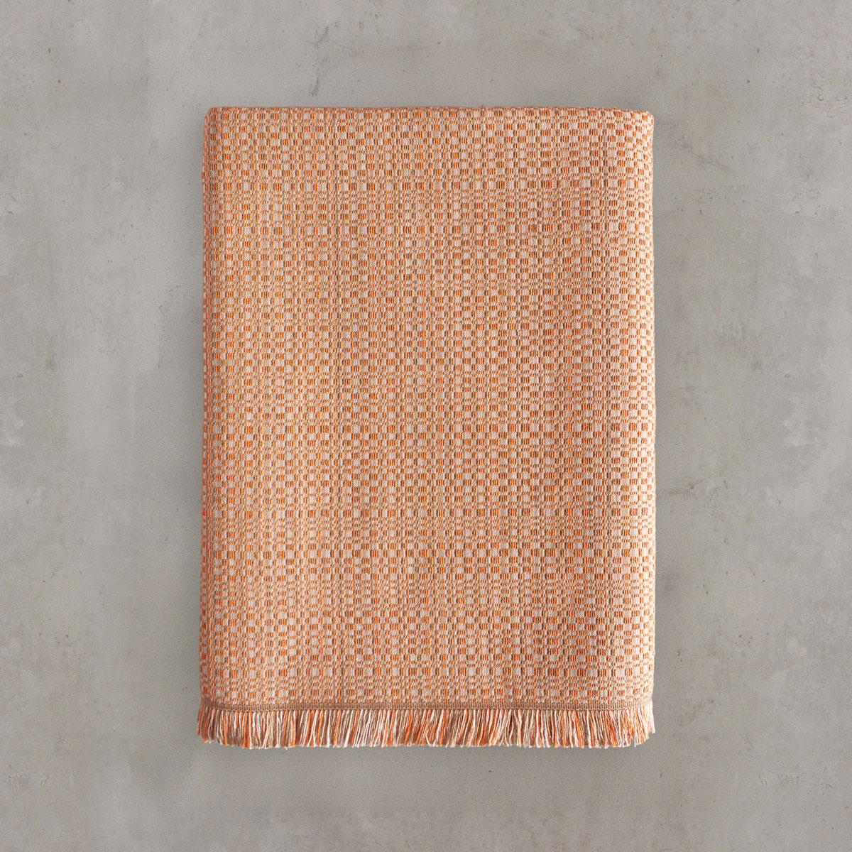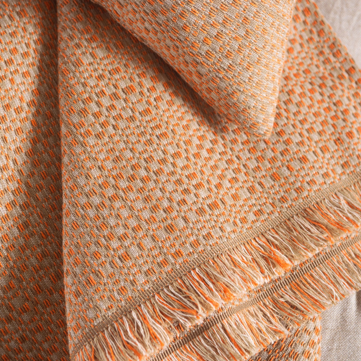 Ριχτάρι για τον διθέσιο καναπέ σε πορτοκαλί αποχρώσεις με μοντέρνο σχέδιο από την εταιρεία Rythmos. Είναι κατασκευασμένο από ζακάρ ύφασμα σύνθεσης 80% βαμβάκι και 20% polyester, που το καθιστά ιδανικό για όλους τους μήνες του χρόνου. Διαθέτει κρόσσια στο τελείωμα. Συνδυάστε το με τα υπόλοιπα είδη της ίδιας σειράς για ένα αρμονικό αποτέλεσμα στο σαλόνι σας.