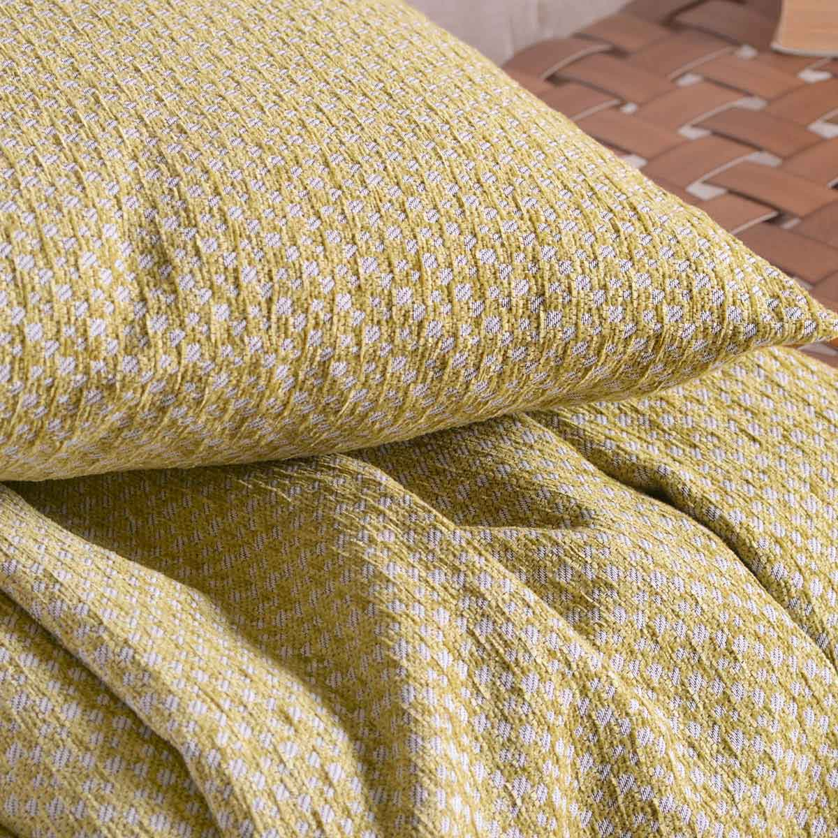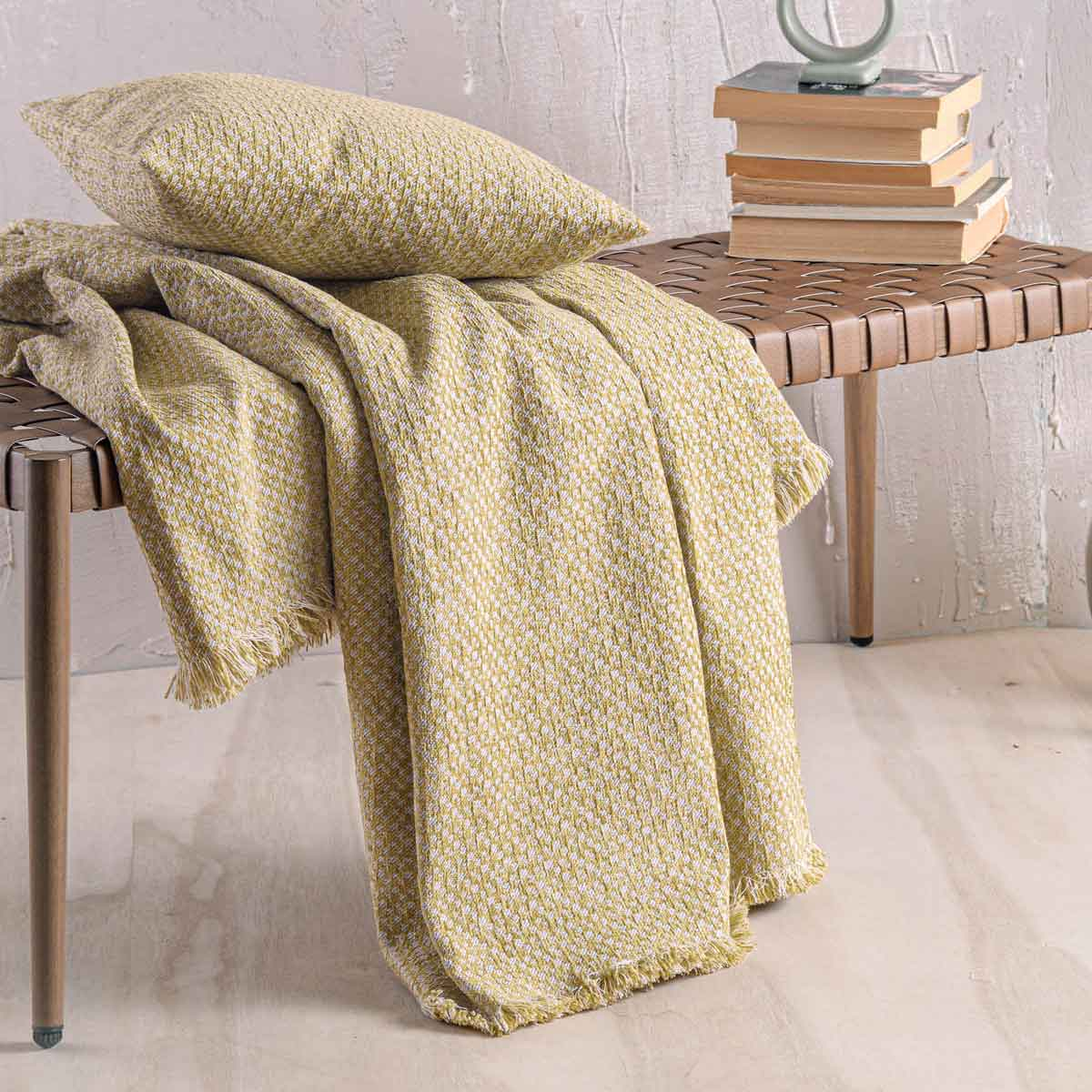 Ριχτάρι για την πολυθρόνα στο χρώμα της ώχρας, με λευκές λεπτομέρειες και μοντέρνο σχέδιο από την εταιρεία Rythmos. Το ύφασμα είναι από 50% chenille, 25% βαμβάκι και 25% polyester που το καθιστά μαλακό και ανθεκτικό. Ιδανικό για όλους τους μήνες του χρόνου και κυρίως τους χειμερινούς. Συνδυάστε το με τα υπόλοιπα είδη του ίδιου σχεδίου για ένα ολοκληρωμένο αποτέλεσμα.