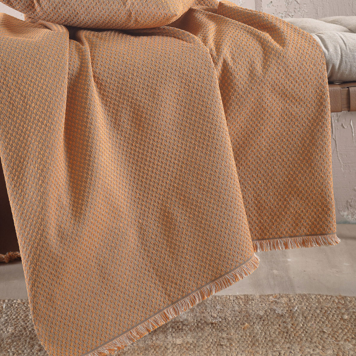 Ριχτάρι πολυθρόνας σε πορτοκαλί χρώμα με μοντέρνο σχέδιο από την εταιρεία Rythmos. Είναι κατασκευασμένο από ζακάρ ύφασμα σύνθεσης 80% βαμβάκι και 20% polyester, που το καθιστά ιδανικό για όλους τους μήνες του χρόνου. Διαθέτει κρόσσια στο τελείωμα. Συνδυάστε το με τα υπόλοιπα είδη της ίδιας σειράς για ένα αρμονικό αποτέλεσμα στο σαλόνι σας.