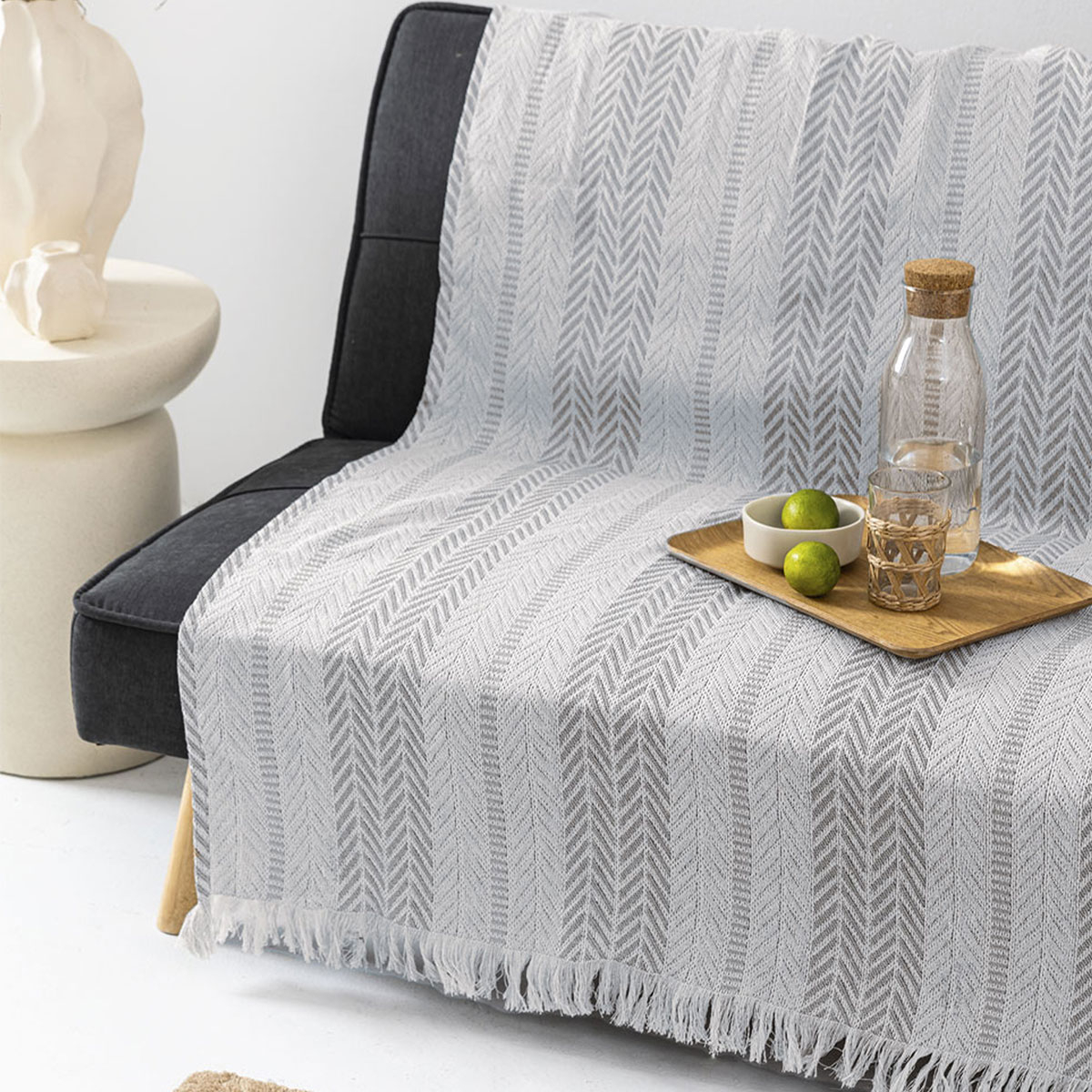 Ριχτάρι για τετραθέσιο καναπέ με μοντέρνο σχέδιο σε 2 αποχρώσεις και κρόσια στο τελείωμα από την εταιρεία Palamaiki. Η σύνθεση του είναι από 80% βαμβάκι και 20% polyester που το καθιστά ιδανικό το καλοκαίρι αλλά και όλο τον χρόνο. Συνδυάστε το με τα υπόλοιπα προϊόντα του ίδιου σχεδίου για ένα ολοκληρωμένο αποτέλεσμα στο σαλόνι σας.