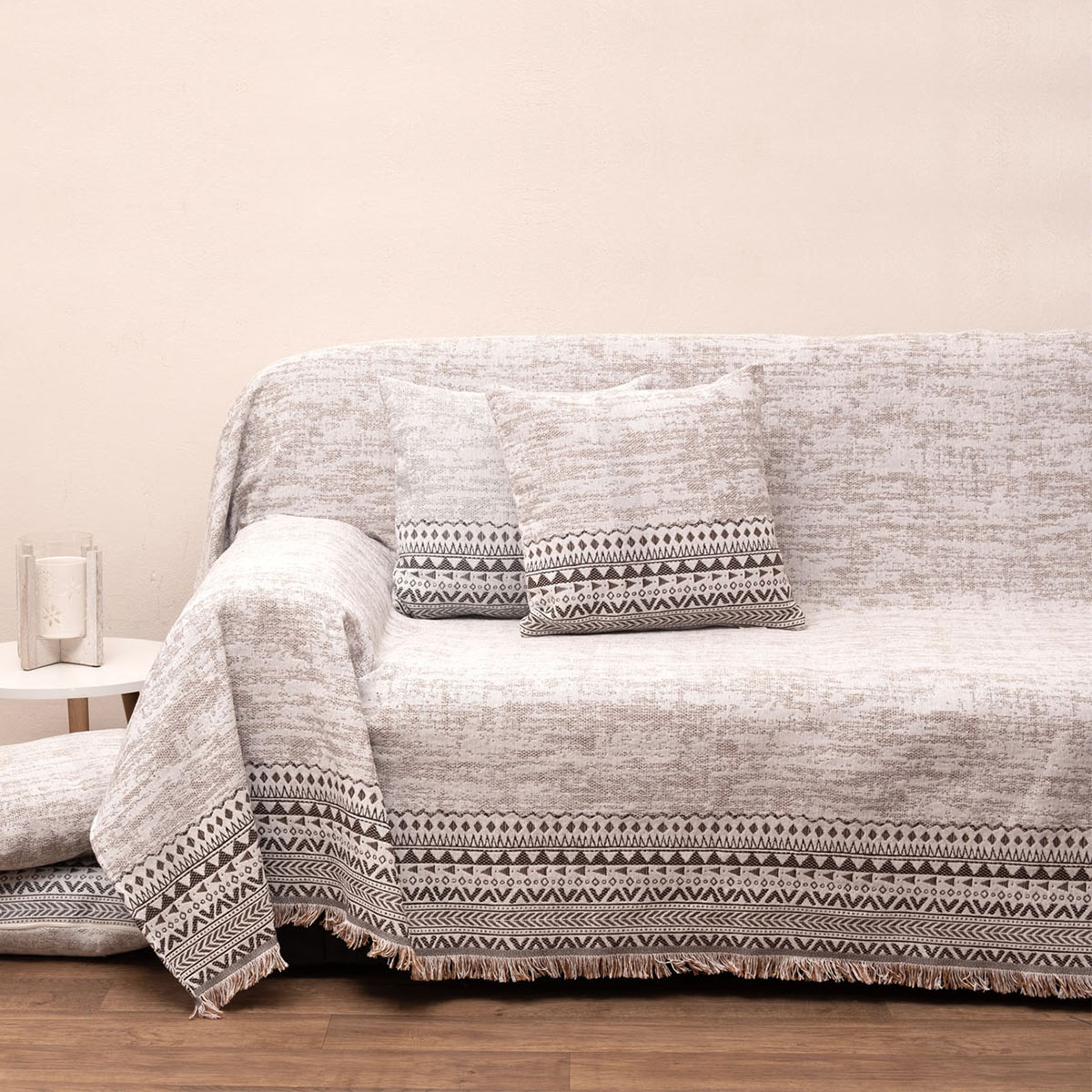 Ριχτάρι για τετραθέσιο καναπέ από την εταιρεία Viopros σε μπεζ χρώμα με έθνικ φάσα και κρόσια στο τελείωμα. Είναι κατασκευασμένο από ζακάρ βαμβακερό ύφασμα που το καθιστά ιδανικό για χρήση όλο το χρόνο. Συνδυάστε το με τα υπόλοιπα προϊόντα της ίδιας σειράς για ένα ολοκληρωμένο αποτέλεσμα στο σαλόνι σας.
