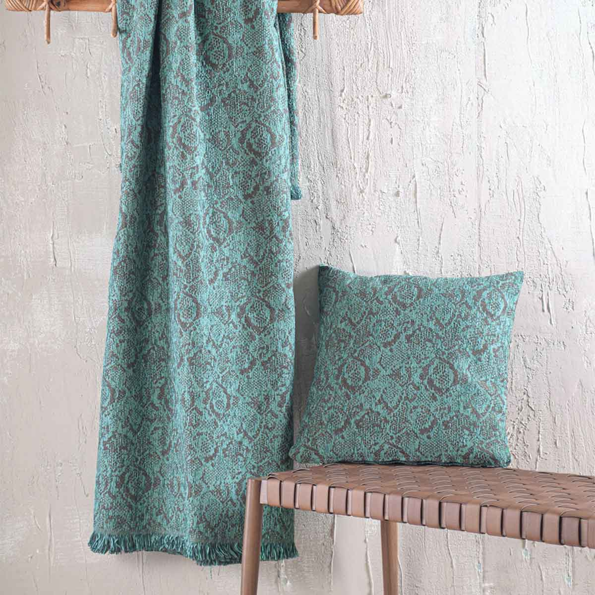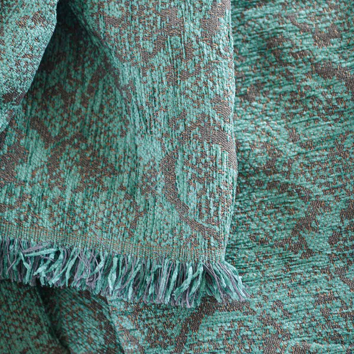 Ριχτάρι για τετραθέσιο καναπέ σε πετρόλ χρώμα, με γκρι λεπτομέρειες και animal print σχέδιο από την εταιρεία Rythmos. Το ύφασμα είναι από 50% chenille, 25% βαμβάκι και 25% polyester που το καθιστά μαλακό και ανθεκτικό. Ιδανικό για όλους τους μήνες του χρόνου και κυρίως τους χειμερινούς. Συνδυάστε το με τα υπόλοιπα είδη του ίδιου σχεδίου για ένα ολοκληρωμένο αποτέλεσμα.