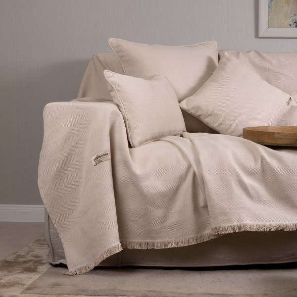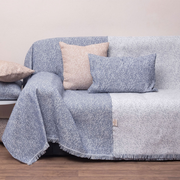 Ριχτάρι διπλής όψης για τετραθέσιο καναπέ της εταιρείας Viopros με κρόσια στο τελείωμα Η μία πλευρά είναι μπλε με γκρι λεπτομέρειες και η άλλη είναι σε γκρι αποχρώσεις. Είναι κατασκευασμένο από ζακάρ ύφασμα σύνθεσης 80% βαμβάκι 20% polyester που το καθιστά ιδανικό για χρήση όλο το χρόνο. Συνδυάστε το με τα υπόλοιπα προϊόντα της ίδιας σειράς για ένα ολοκληρωμένο αποτέλεσμα στο σαλόνι σας.
