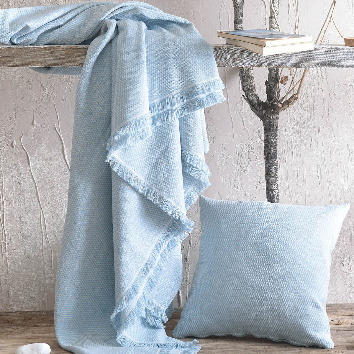 Ριχτάρι για τριθέσιο καναπέ της εταιρείας Rythmos σε γαλάζιο χρώμα με λευκές λεπτομέρειες και μοντέρνο σχέδιο. Το ζακάρ ύφασμα από 80% βαμβάκι και 20% polyester το καθιστά ιδανικό για όλους τους μήνες του χρόνου. Διαθέτει κρόσια στο τελείωμα. Συνδυάστε το με τις υπόλοιπες διαστάσεις του ίδιου σχεδίου για ένα ολοκληρωμένο αποτέλεσμα.