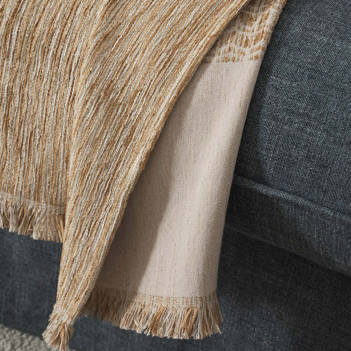 Ριχτάρι για τον τριθέσιο καναπέ από την εταιρεία Gofis Home σε μπεζ αποχρώσεις, με φαρδιά φάσα και κοντό κρόσσι. Κατασκευασμένο από 70% ακρυλικό chenille και 30% βαμβάκι, με μαλακή αίσθηση. Παραμένει σταθερό πάνω στην πολυθρόνα και είναι ιδανικό για τους χειμερινούς μήνες. Συνδυάστε το με τα υπόλοιπα προϊόντα της ίδιας συλλογής για ένα ολοκληρωμένο και αρμονικό αποτέλεσμα.