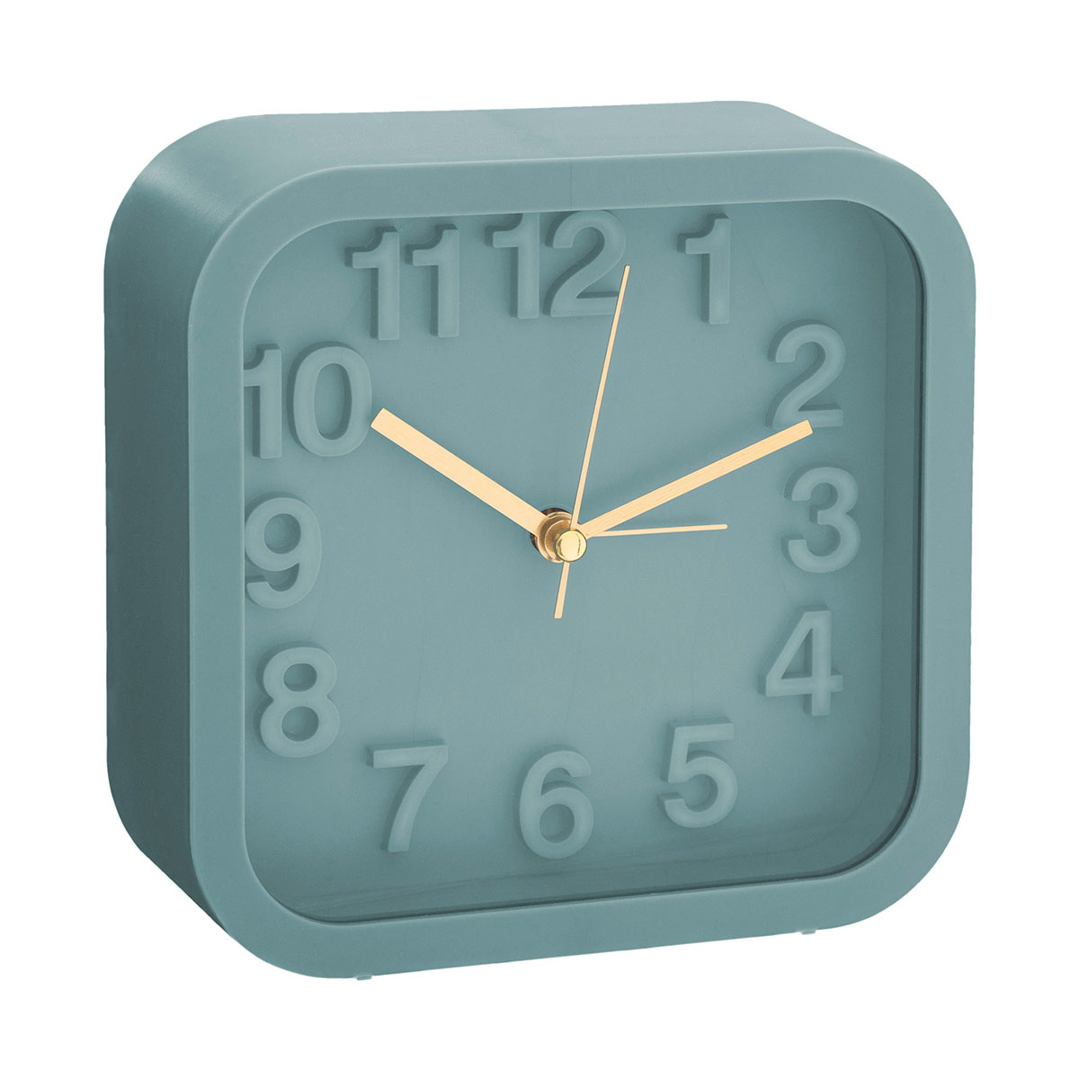 Επιτραπέζιο ρολόι - ξυπνητήρι με μοντέρνα αισθητική. Είναι κατασκευασμένο από πλαστικό υλικό σε ανοιχτό μπλε χρώμα και έχει τετράγωνο σχήμα. Λειτουργεί με 1 AA μπαταρία LR6 η οποία δεν περιλαμβάνεται. Ιδανικό να τοποθετηθεί στο κομοδίνο ή το γραφείο σας καθώς είναι αθόρυβο, δηλαδή δεν ακούγονται οι χτύποι του.
