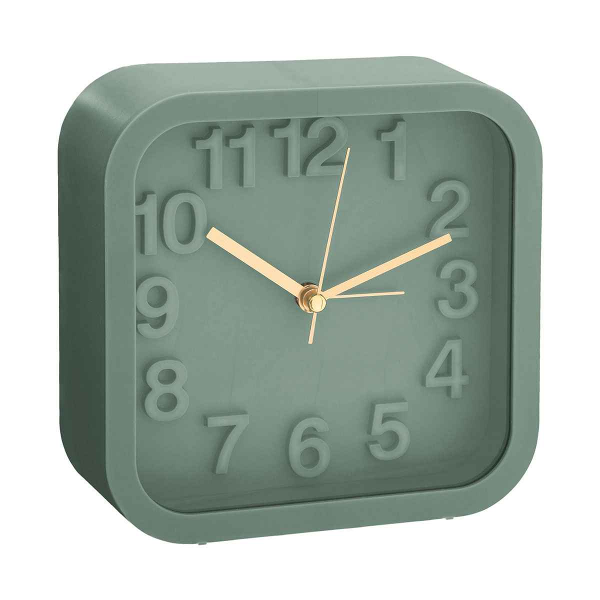 Επιτραπέζιο ρολόι - ξυπνητήρι με μοντέρνα αισθητική. Είναι κατασκευασμένο από πλαστικό υλικό σε χακί χρώμα και έχει τετράγωνο σχήμα. Λειτουργεί με 1 AA μπαταρία LR6 η οποία δεν περιλαμβάνεται. Ιδανικό να τοποθετηθεί στο κομοδίνο ή το γραφείο σας καθώς είναι αθόρυβο, δηλαδή δεν ακούγονται οι χτύποι του.