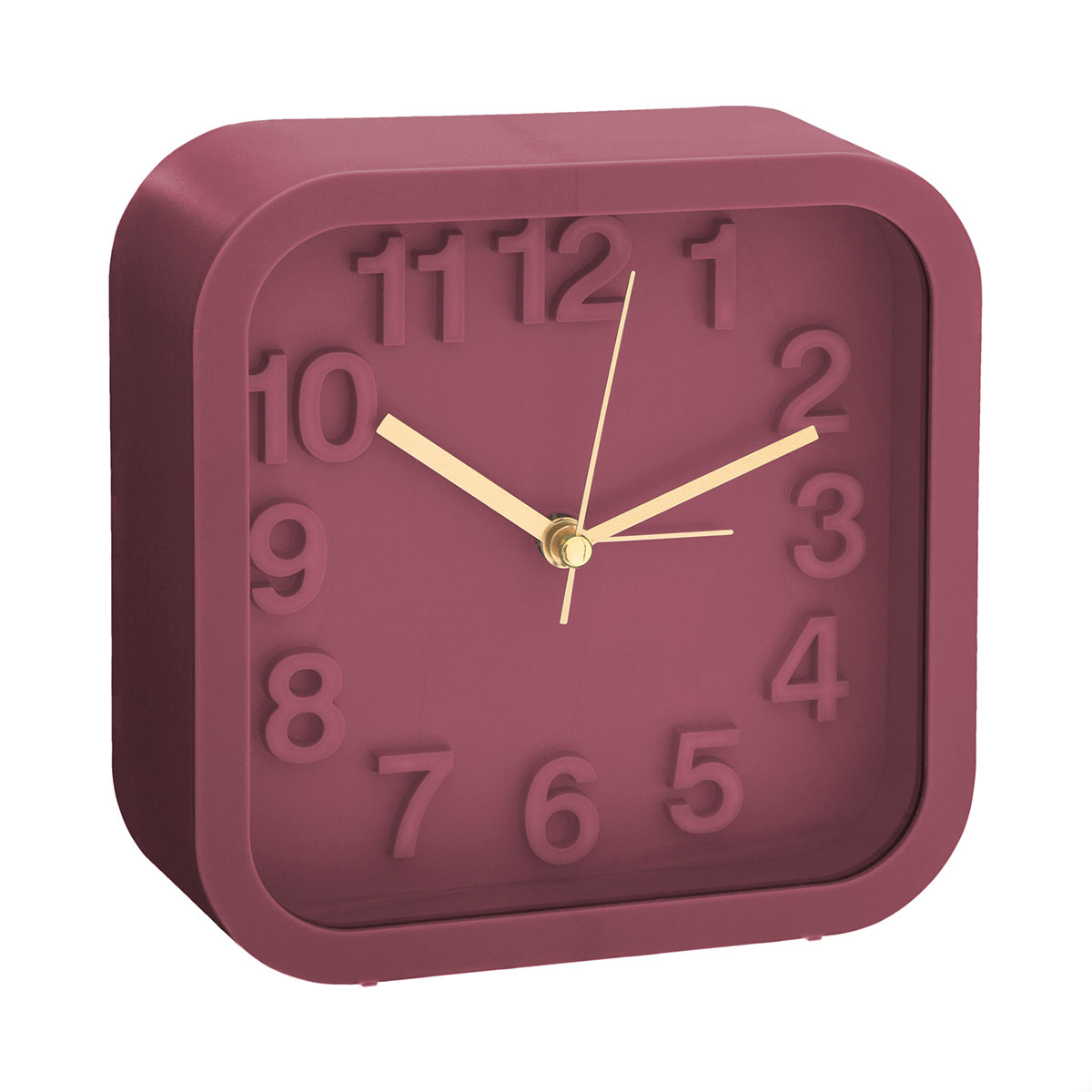 Επιτραπέζιο ρολόι - ξυπνητήρι με μοντέρνα αισθητική. Είναι κατασκευασμένο από πλαστικό υλικό σε μπορντώ χρώμα και έχει τετράγωνο σχήμα. Λειτουργεί με 1 AA μπαταρία LR6 η οποία δεν περιλαμβάνεται. Ιδανικό να τοποθετηθεί στο κομοδίνο ή το γραφείο σας καθώς είναι αθόρυβο, δηλαδή δεν ακούγονται οι χτύποι του.