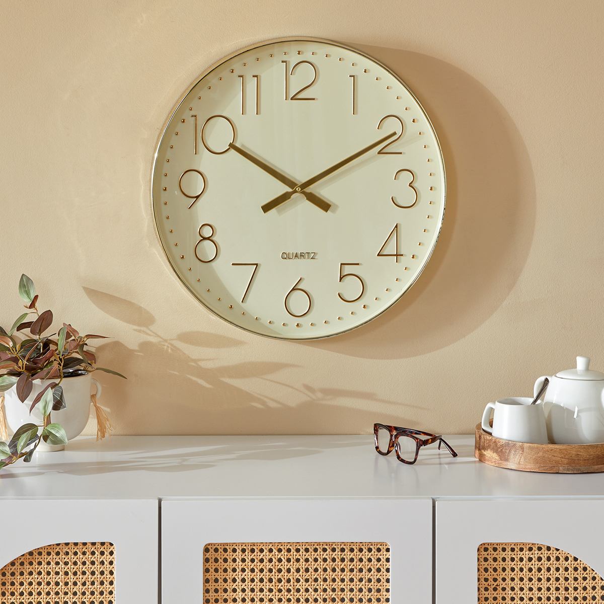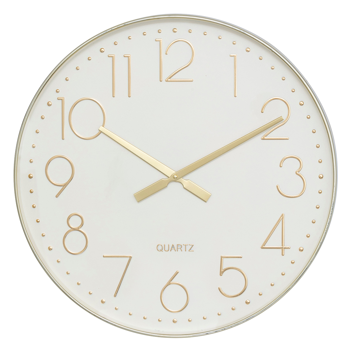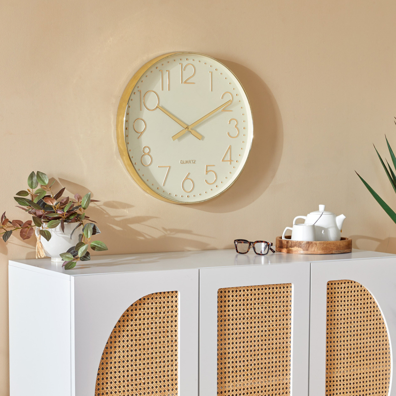 Ρολόι τοίχου με αθόρυβη λειτουργία και μοντέρνο σχεδιασμό. Είναι κατασκευασμένο από πλαστικό υλικό σε χρυσό χρώμα με εκρού καντράν. Λειτουργεί με 1 μπαταρία AA LR6, η οποία δεν περιλαμβάνεται. Ιδανικό να τοποθετηθεί σε όλους τους χώρους του σπιτιού ή στο γραφείο, καθώς δεν ακούγονται οι χτύποι του.