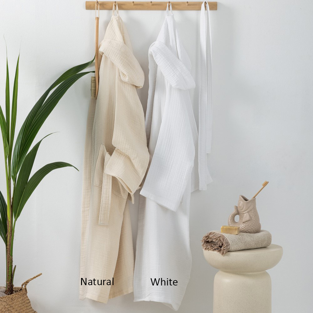 Γυναικεία ρόμπα σε λευκό χρώμα από την εταιρεία Palamaiki. Διαθέτει ζώνη και κουκούλα. Είναι κατασκευασμένη από μουσελίνα σύνθεσης 100% βαμβάκι βάρους 220gsm που την καθιστά πολύ μαλακή και απαλή. Ιδανική για τους ανοιξιάτικους και καλοκαιρινούς μήνες.